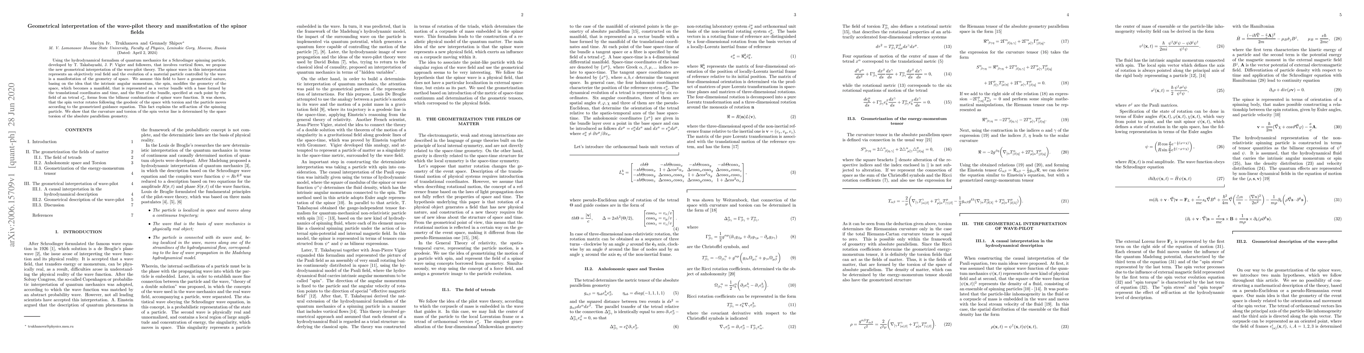 This paper proposes a geometrical interpretation of the wave-pilot theory using hydrodynamical quantum mechanics, suggesting that the spinor wave represents an objectively real field. The intrinsic angular momentum of a spinning particle modifies space geometry, leading to a manifold represented by a vector bundle, where the spin vector follows a geodesic in a space with torsion.