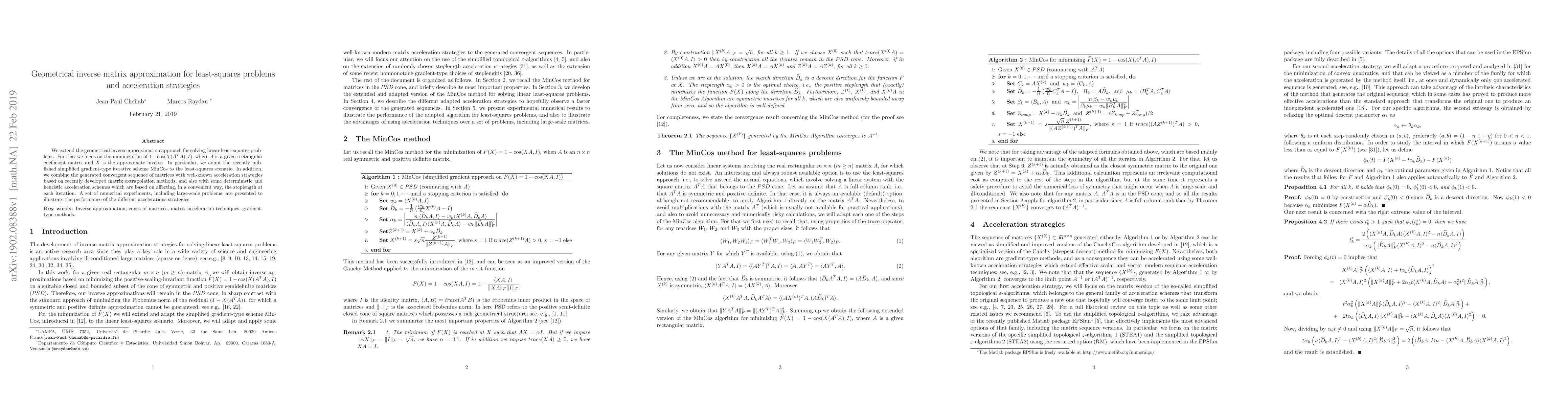 This paper proposes a geometrical inverse matrix approximation for solving linear least-squares problems, adapting the MinCos iterative scheme and combining it with various acceleration strategies, including matrix extrapolation and heuristic steplength adjustments. Numerical experiments demonstrate the effectiveness of these acceleration methods.