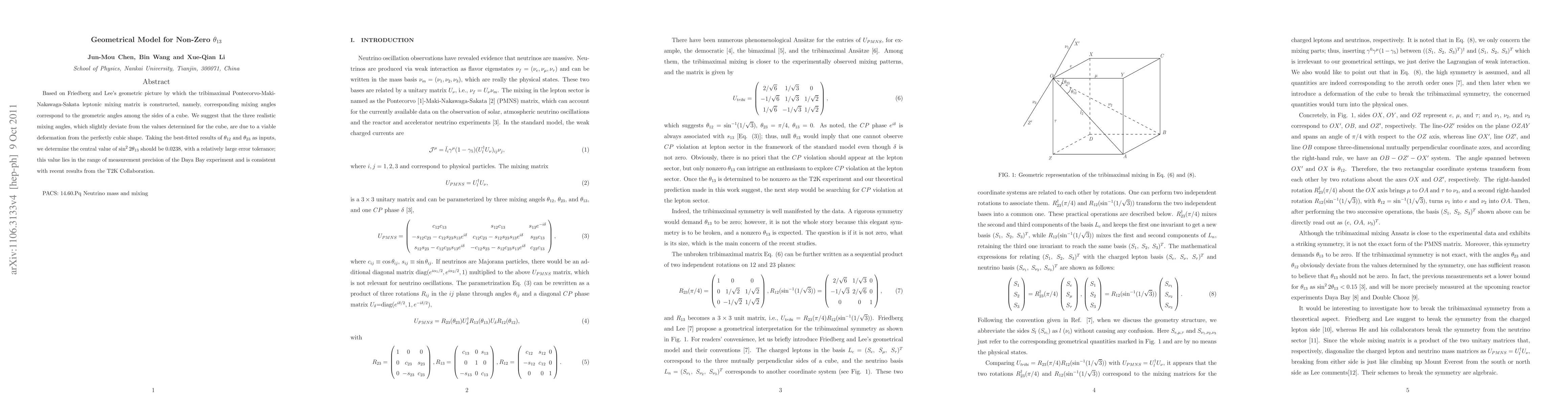 Based on Friedberg and Lee's geometric picture by which the tribimaximal Pontecorvo-Maki-Nakawaga-Sakata leptonic mixing matrix is constructed, namely, corresponding mixing angles correspond to the geometric angles among the sides of a cube. We suggest that the three realistic mixing angles, which slightly deviate from the values determined for the cube, are due to a viable deformation from the perfectly cubic shape. Taking the best-fitted results of $\theta_{12}$ and $\theta_{23}$ as inputs, we determine the central value of $\sin^22\theta_{13}$ should be 0.0238, with a relatively large error tolerance; this value lies in the range of measurement precision of the Daya Bay experiment and is consistent with recent results from the T2K Collaboration.