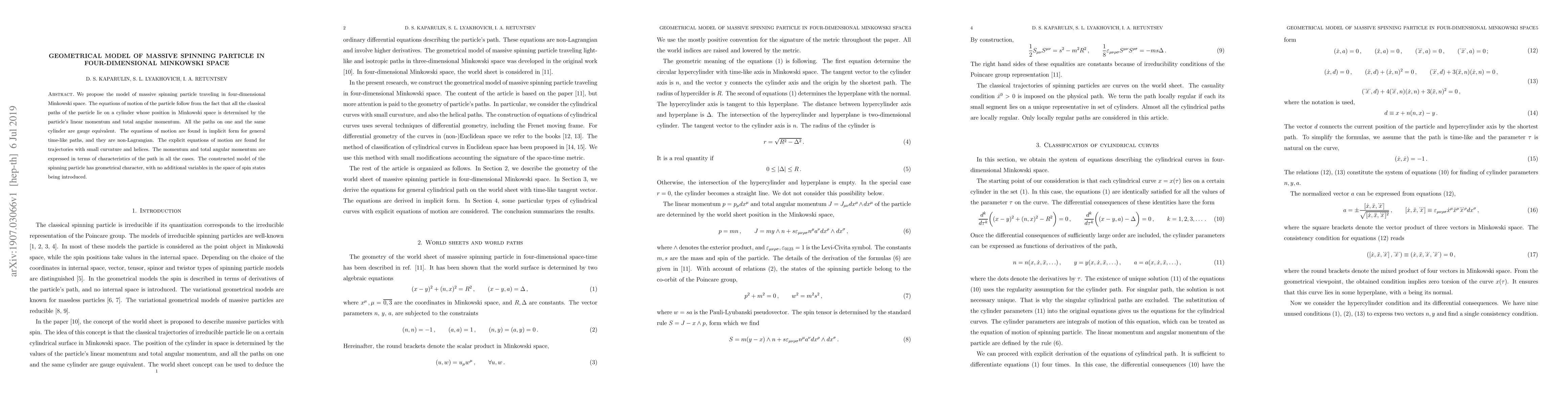 A new model describes a massive spinning particle in 4D space, where its path lies on a cylinder with momentum and angular momentum determined by the particle's trajectory. The model has geometrical character and no additional variables are introduced to describe spin states.