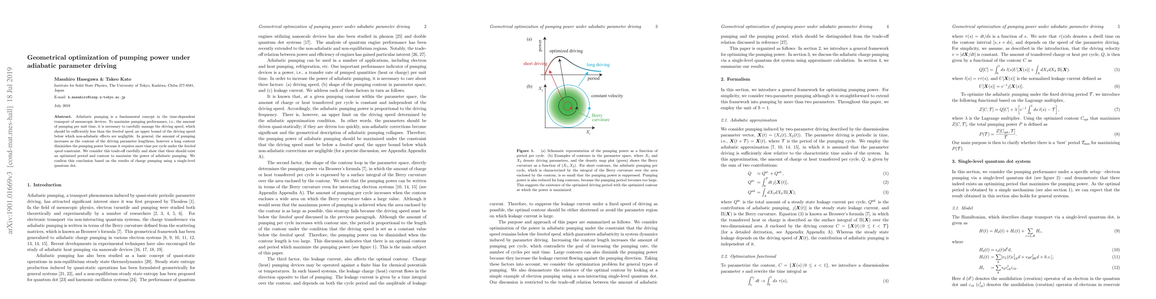 This paper investigates the optimization of pumping power in adiabatic transport through mesoscopic devices, finding an optimal driving period and contour length that maximize pumping performance while minimizing non-adiabatic effects. Experimental results with a single-level quantum dot validate the theoretical findings.