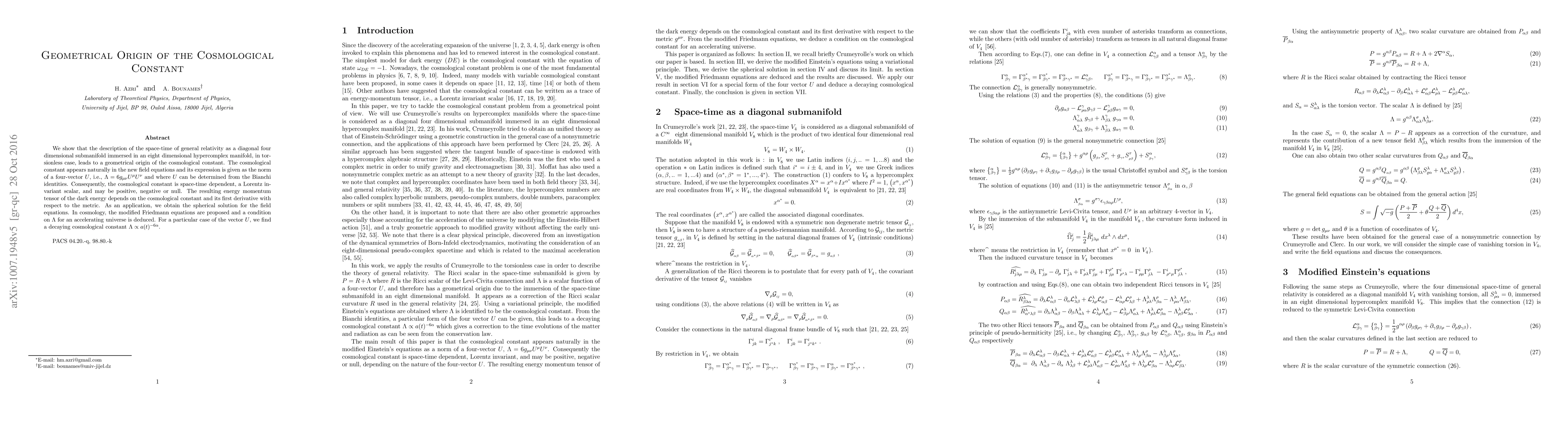 We show that the description of the space-time of general relativity as a diagonal four dimensional submanifold immersed in an eight dimensional hypercomplex manifold, in torsionless case, leads to a geometrical origin of the cosmological constant. The cosmological constant appears naturally in the new field equations and its expression is given as the norm of a four-vector $U$, i.e., ${\Lambda}=6g_{{\mu}{\nu}}U^{{\mu}}U^{{\nu}}$ and where U can be determined from the Bianchi identities. Consequently, the cosmological constant is space-time dependent, a Lorentz invariant scalar, and may be positive, negative or null. The resulting energy momentum tensor of the dark energy depends on the cosmological constant and its first derivative with respect to the metric. As an application, we obtain the spherical solution for the field equations. In cosmology, the modified Friedmann equations are proposed and a condition on ${\Lambda}$ for an accelerating universe is deduced. For a particular case of the vector $U$, we find a decaying cosmological constant ${\Lambda}\propto a(t)^{-6{\alpha}}$.