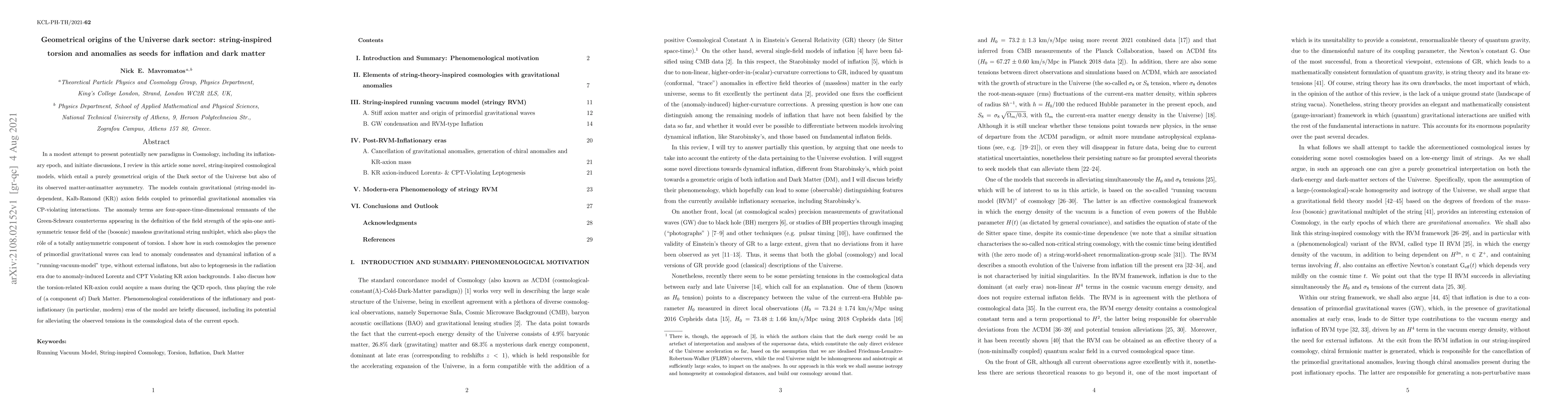 In a modest attempt to present potentially new paradigms in Cosmology, including its inflationary epoch, and initiate discussions, I review in this article some novel, string-inspired cosmological models, which entail a purely geometrical origin of the Dark sector of the Universe but also of its observed matter-antimatter asymmetry. The models contain gravitational (string-model independent, Kalb-Ramond (KR)) axion fields coupled to primordial gravitational anomalies via CP-violating interactions. The anomaly terms are four-space-time-dimensional remnants of the Green-Schwarz counterterms appearing in the definition of the field strength of the spin-one antisymmetric tensor field of the (bosonic) massless gravitational string multiplet, which also plays the r\^ole of a totally antisymmetric component of torsion. I show how in such cosmologies the presence of primordial gravitational waves can lead to anomaly condensates and dynamical inflation of a "running-vacuum-model" type, without external inflatons, but also to leptogenesis in the radiation era due to anomaly-induced Lorentz and CPT Violating KR axion backgrounds. I also discuss how the torsion-related KR-axion could acquire a mass during the QCD epoch, thus playing the role of (a component of) Dark Matter. Phenomenological considerations of the inflationary and post-inflationary (in particular, modern) eras of the model are briefly discussed, including its potential for alleviating the observed tensions in the cosmological data of the current epoch.