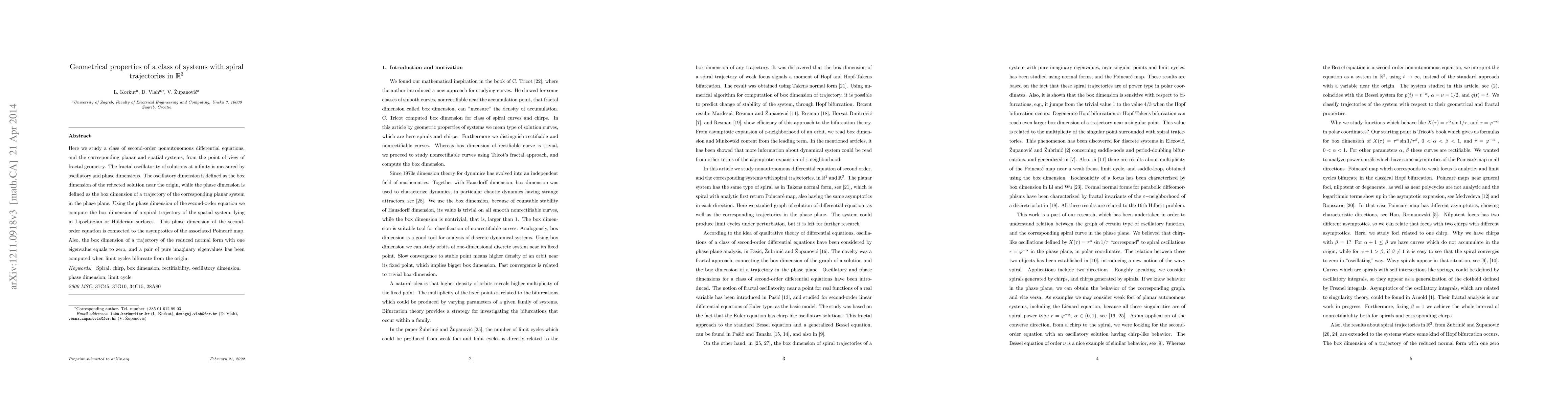 Here we study a class of second-order nonautonomous differential equations, and the corresponding planar and spatial systems, from the point of view of fractal geometry. The fractal oscillatority of solutions at infinity is measured by oscillatory and phase dimensions. The oscillatory dimension is defined as the box dimension of the reflected solution near the origin, while the phase dimension is defined as the box dimension of a trajectory of the corresponding planar system in the phase plane. Using the phase dimension of the second-order equation we compute the box dimension of a spiral trajectory of the spatial system, lying in Lipschitzian or H\" olderian surfaces. This phase dimension of the second-order equation is connected to the asymptotics of the associated Poincar\'e map. Also, the box dimension of a trajectory of the reduced normal form with one eigenvalue equals to zero, and a pair of pure imaginary eigenvalues has been computed when limit cycles bifurcate from the origin.