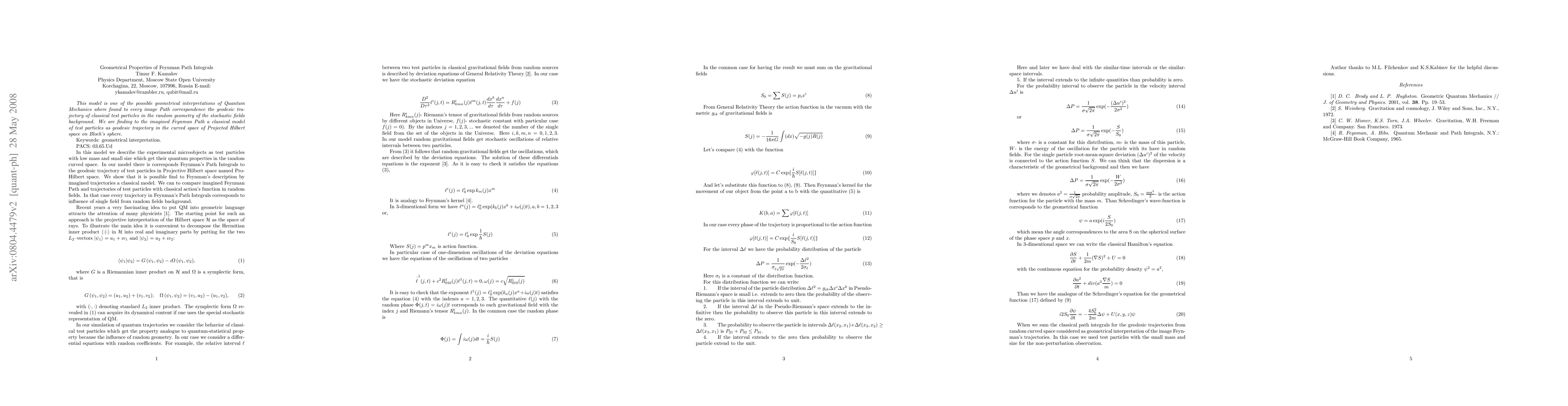 This model is one of the possible geometrical interpretations of Quantum Mechanics where found to every image Path correspondence the geodesic trajectory of classical test particles in the random geometry of the stochastic fields background. We are finding to the imagined Feynman Path a classical model of test particles as geodesic trajectory in the curved space of Projected Hilbert space on Bloch's sphere.