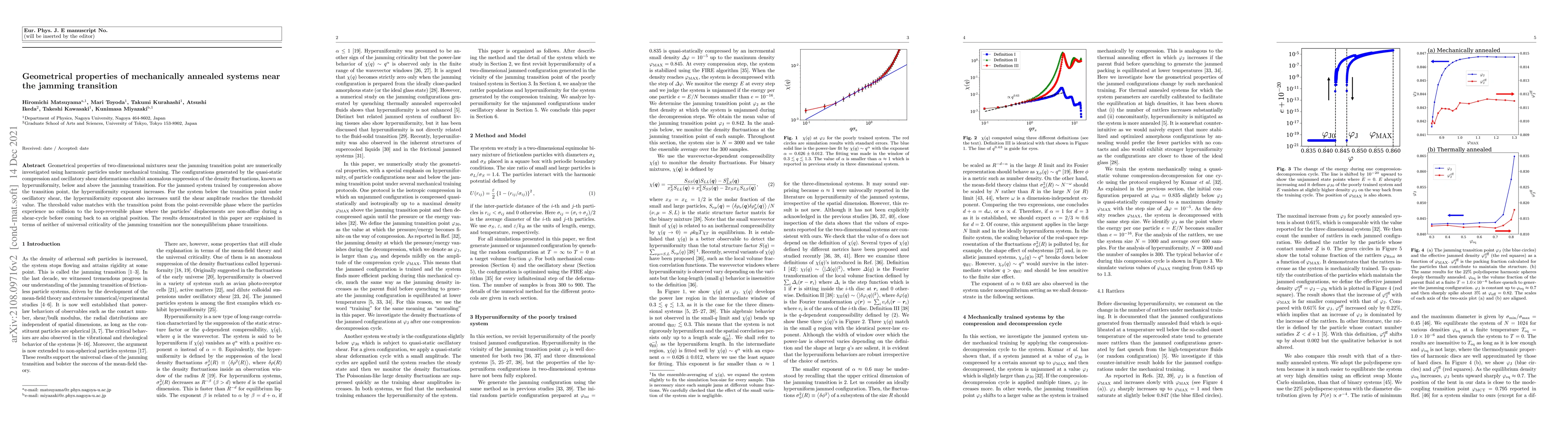 This paper investigates the geometrical properties of two-dimensional mixtures near the jamming transition using harmonic particles under mechanical training. It finds that configurations exhibit anomalous density fluctuations suppression, termed hyperuniformity, with an increasing hyperuniformity exponent above the jamming transition under compression and below it under oscillatory shear until reaching a threshold value.