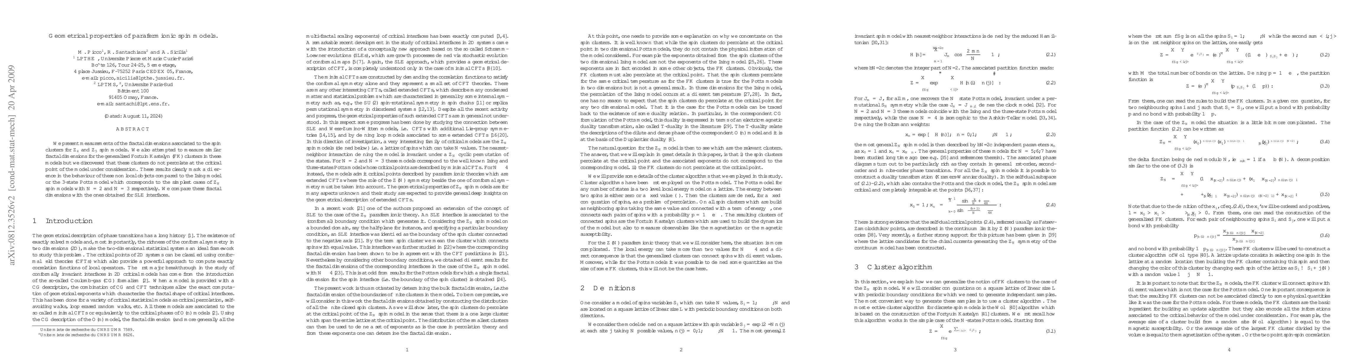 This paper investigates the fractal dimensions of geometrical clusters in Z_4 and Z_5 parafermionic spin models, finding differences compared to Ising and Potts models. The study reveals that generalized Fortuyin-Kastelyn clusters do not percolate at the critical point, contrasting with simpler Z_N models.