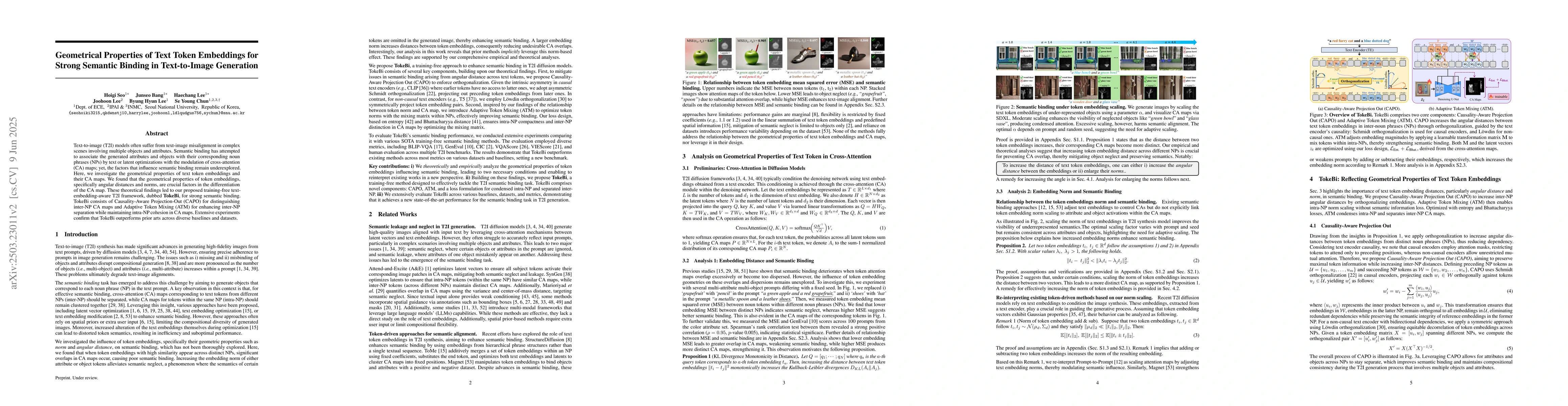 Researchers found that the geometrical properties of text token embeddings affect semantic binding in text-to-image generation, leading to a new training-free framework called TokeBi that outperforms prior arts.