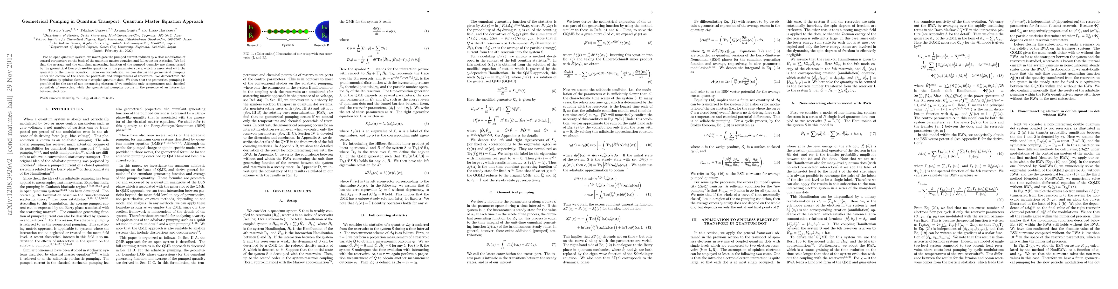 This paper explores pumped current in open quantum systems via a slow modulation of control parameters, revealing that geometrical pumping is characterized by Berry-phase-like quantities. The study shows that geometrical pumping is absent for non-interacting electrons but occurs with electron interactions, demonstrated through spinless electrons in coupled quantum dots.
