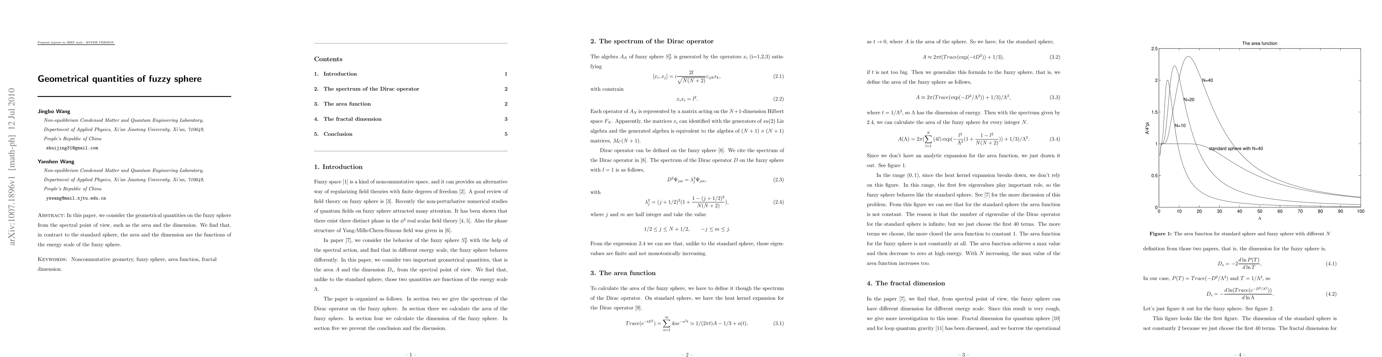 Summary: This paper investigates geometrical quantities on a fuzzy sphere, revealing that the area and dimension are energy-scale dependent, contrasting with the fixed properties of a standard sphere. The study employs a spectral approach to understand these properties.