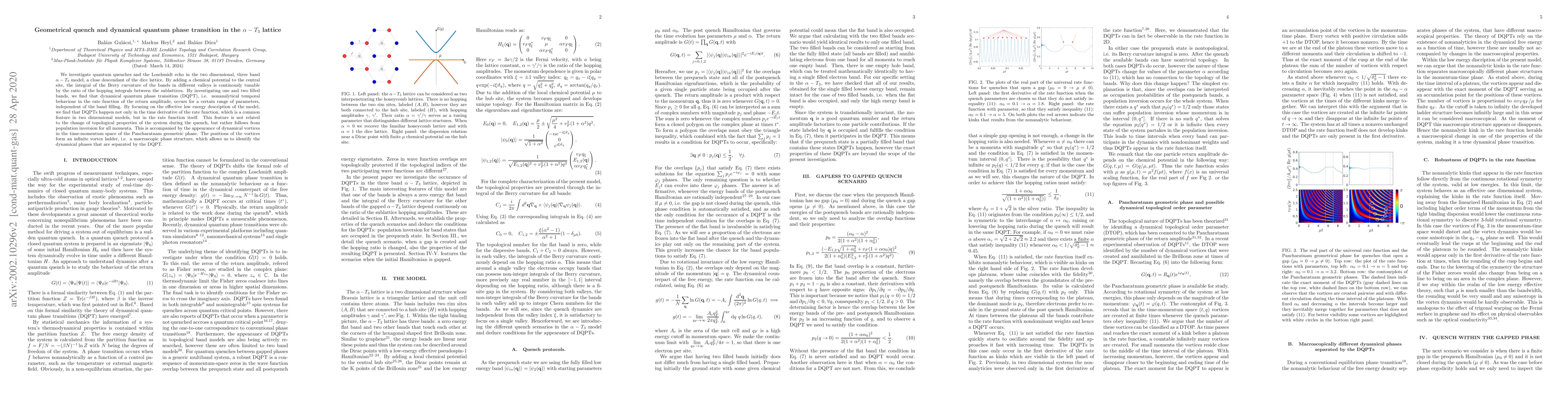 This research explores quantum quenches and dynamical quantum phase transitions (DQPTs) in the two-dimensional, three-band u2202-T3 lattice model. The study reveals that DQPTs occur for a specific parameter range, independent of band filling, and are visible not only in the time derivative but also in the rate function itself. These transitions are linked to population inversion across all momenta and the formation of dynamical vortices in time-momentum space, indicating distinct dynamical phases separated by DQPTs.