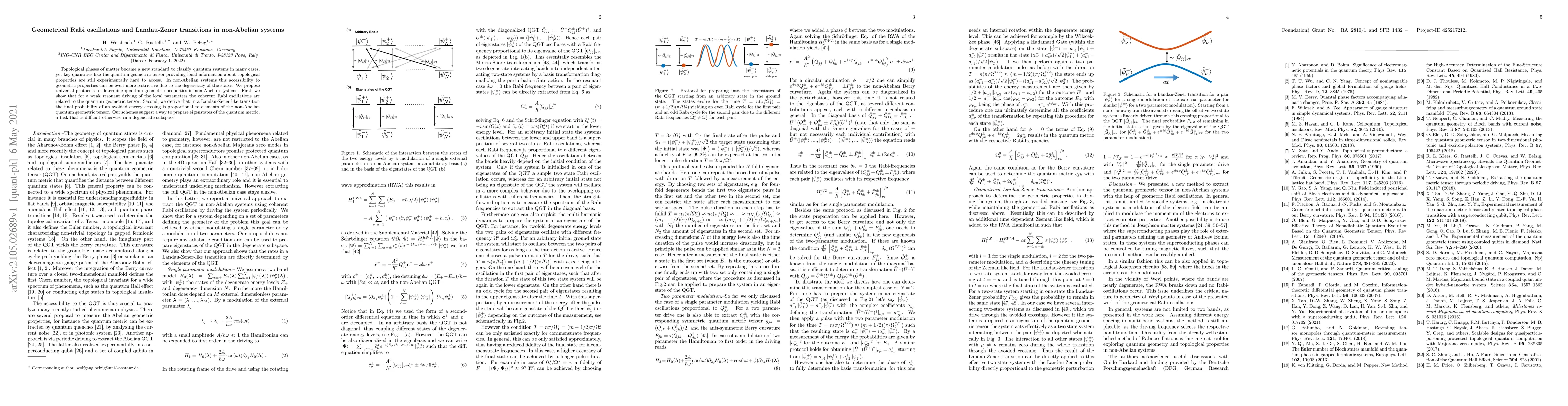 This paper proposes universal protocols to determine quantum geometric properties in non-Abelian systems, showing that Rabi oscillations relate to the quantum geometric tensor and that Landau-Zener transitions depend on the non-Abelian quantum geometric tensor, offering a method to prepare eigenstates of the quantum metric in degenerate subspaces.
