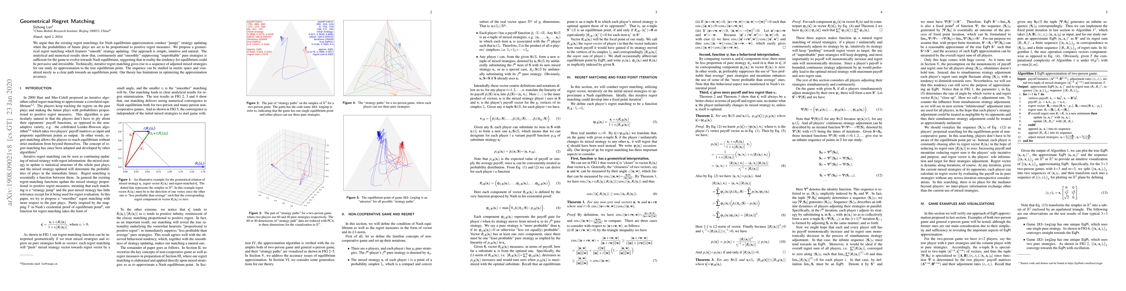 The paper proposes a "geometrical regret matching" method for Nash equilibrium approximation, which features smoother strategy updating compared to existing methods. The approach iteratively suppresses unprofitable strategies, leading to a clear path towards equilibrium in metric space.