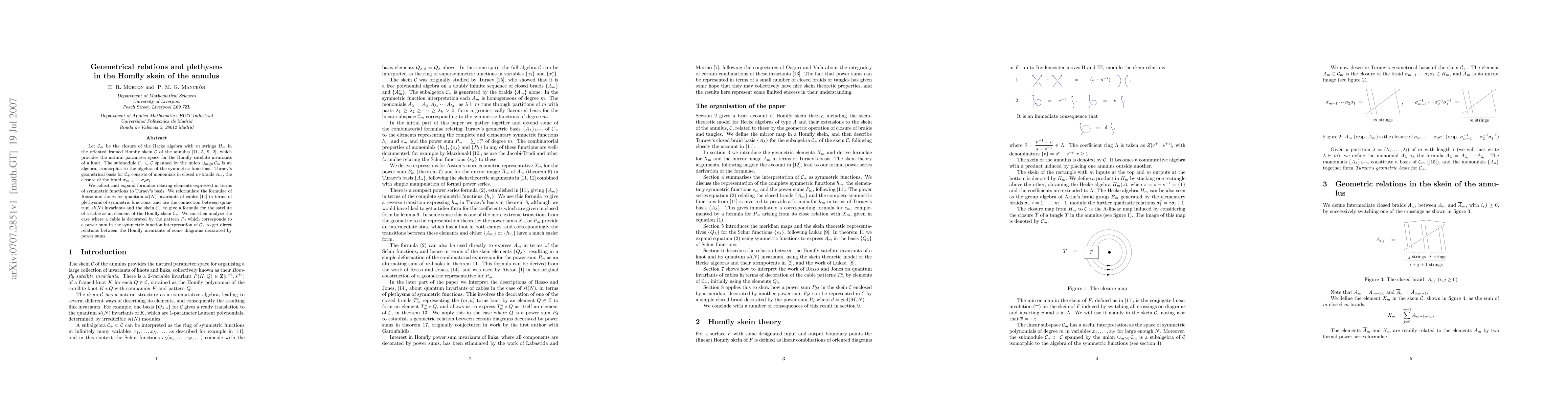 This paper explores the geometrical relations and plethysms within the Homfly skein of the annulus, establishing a connection between the algebra of symmetric functions and Turaev's geometrical basis. It reformulates Rosso and Jones's quantum sl(N) invariants using plethysms and provides a formula for satellite knots in terms of C+.