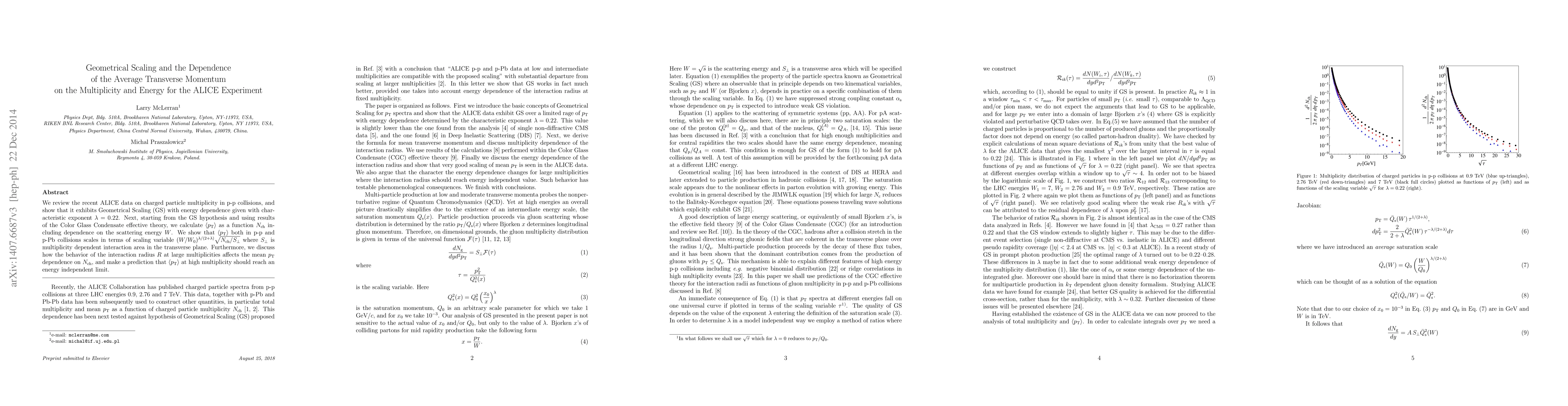 We review the recent ALICE data on charged particle multiplicity in p-p collisions, and show that it exhibits Geometrical Scaling (GS) with energy dependence given with characteristic exponent $\lambda=0.22$. Next, starting from the GS hypothesis and using results of the Color Glass Condensate effective theory, we calculate $< p_{\text{T}}>$ as a function $N_{\rm ch}$ including dependence on the scattering energy $W$. We show that $< p_{\text{T}}>$ both in p-p and p-Pb collisions scales in terms of scaling variable $(W/W_{0})^{\lambda/(2+\lambda)}% \sqrt{N_{\mathrm{ch}}/S_{\bot}}$ where $S_{\bot}$ is multiplicity dependent interaction area in the transverse plane. Furthermore, we discuss how the behavior of the interaction radius $R$ at large multiplicities affects the mean $p_{\mathrm{T}}$ dependence on $N_{\rm ch}$, and make a prediction that $< p_{\text{T}}>$ at high multiplicity should reach an energy independent limit.
