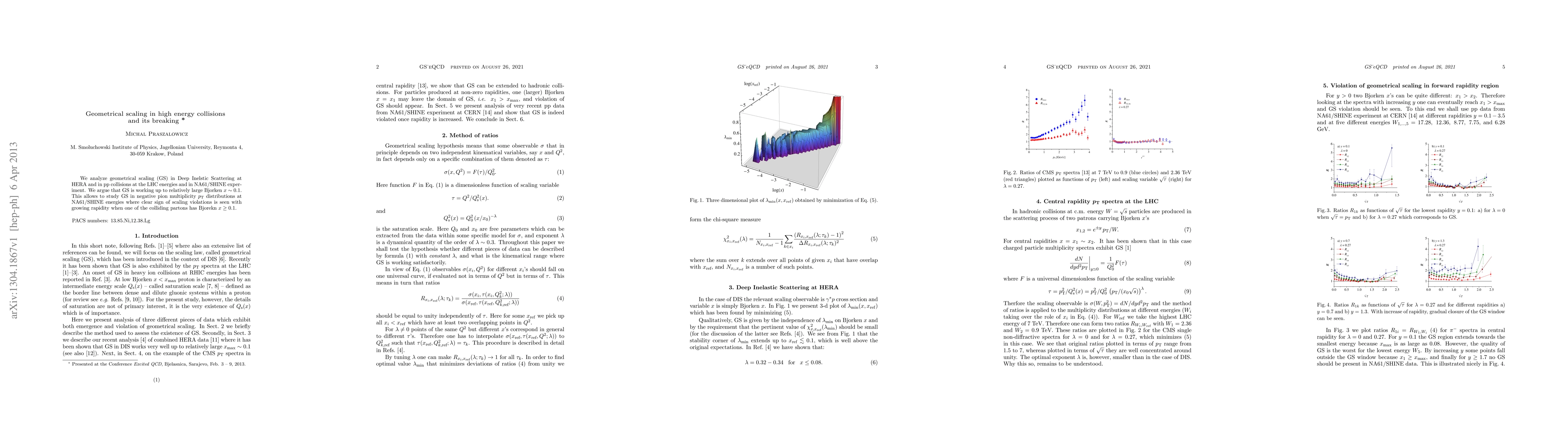 We analyze geometrical scaling (GS) in Deep Inelstic Scattering at HERA and in pp collisions at the LHC energies and in NA61/SHINE experiment. We argue that GS is working up to relatively large Bjorken $x \sim 0.1$. This allows to study GS in negative pion multiplicity $p_{\rm T}$ distributions at NA61/SHINE energies where clear sign of scaling violations is seen with growing rapidity when one of the colliding partons has Bjorekn $x \ge 0.1$.