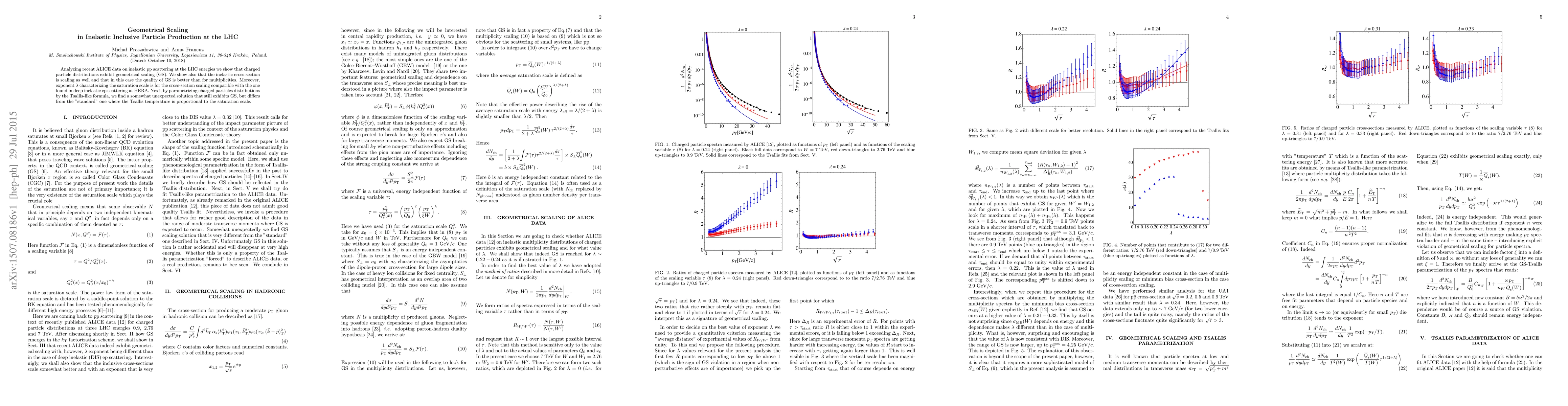 Analyzing recent ALICE data on inelastic pp scattering at the LHC energies we show that charged particle distributions exhibit geometrical scaling (GS). We show also that the inelastic cross-section is scaling as well and that in this case the quality of GS is better than for multiplicities. Moreover, exponent $\lambda$ characterizing the saturation scale is for the cross-section scaling compatible with the one found in deep inelastic ep scattering at HERA. Next, by parametrizing charged particles distributions by the Tsallis-like formula, we find a somewhat unexpected solution that still exhibits GS, but differs from the "standard" one where the Tsallis temperature is proportional to the saturation scale.