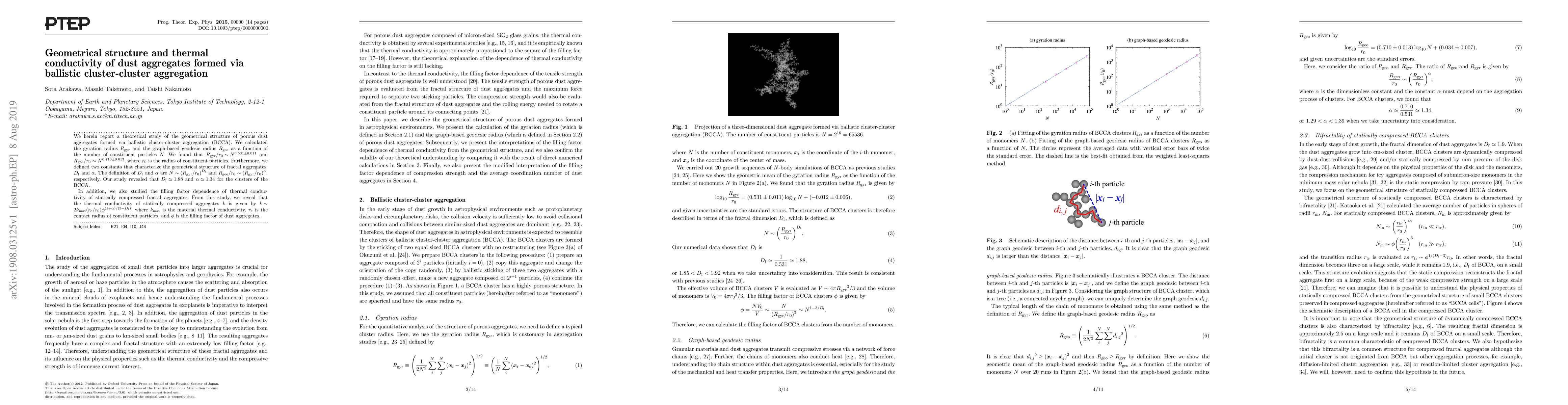 This paper investigates the geometrical structure and thermal conductivity of dust aggregates formed through ballistic cluster-cluster aggregation. It finds that the aggregates' gyration radius scales as $N^{0.531}$ and the geodesic radius as $N^{0.710}$, with fractal dimension $D_{\rm f} \simeq 1.88$ and scaling factor $\alpha \simeq 1.34$. The thermal conductivity of these aggregates is shown to depend on the material's conductivity, particle contact radius, and filling factor.