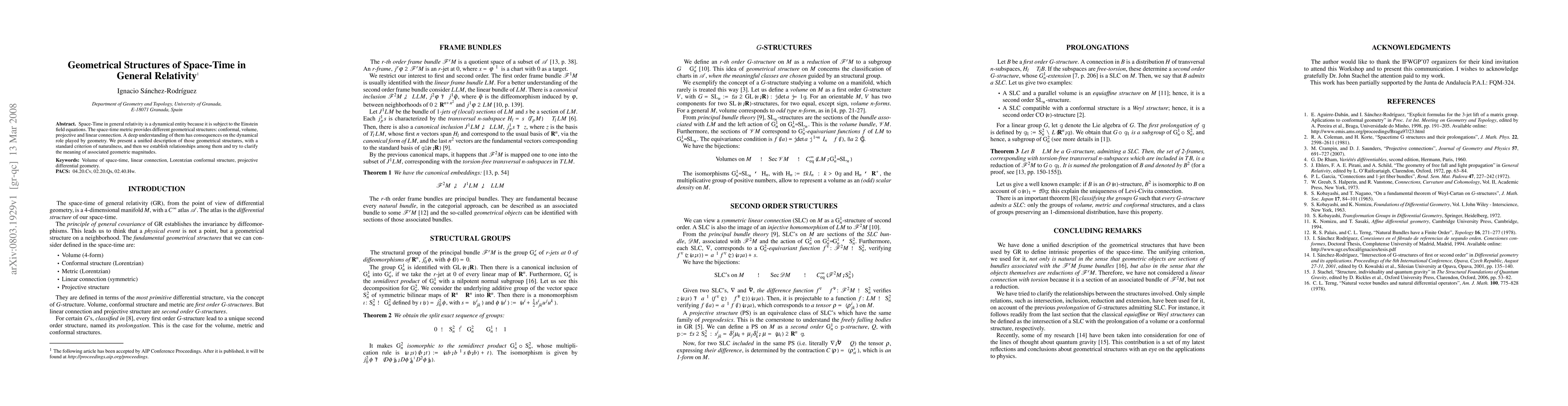 Space-Time in general relativity is a dynamical entity because it is subject to the Einstein field equations. The space-time metric provides different geometrical structures: conformal, volume, projective and linear connection. A deep understanding of them has consequences on the dynamical role played by geometry. We present a unified description of those geometrical structures, with a standard criterion of naturalness, and then we establish relationships among them and try to clarify the meaning of associated geometric magnitudes.