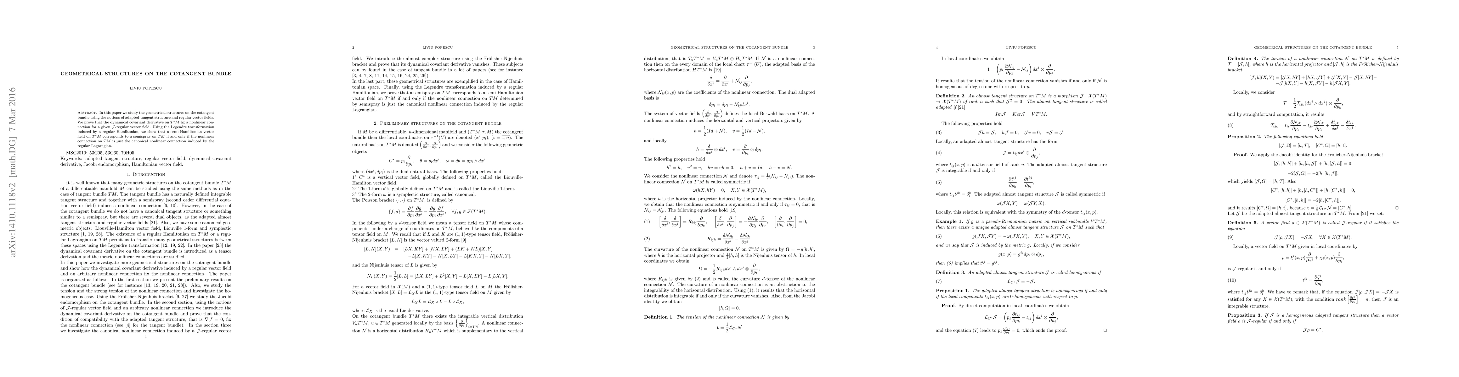 This paper explores geometrical structures on the cotangent bundle using adapted tangent structures and regular vector fields. It proves that a dynamical covariant derivative on T*M corresponds to a nonlinear connection for a given J-regular vector field. Through Legendre transformation, it establishes a one-to-one correspondence between semi-Hamilonian vector fields on T*M and semisprays on TM, contingent on the nonlinear connection on TM being the canonical one induced by a regular Lagrangian.