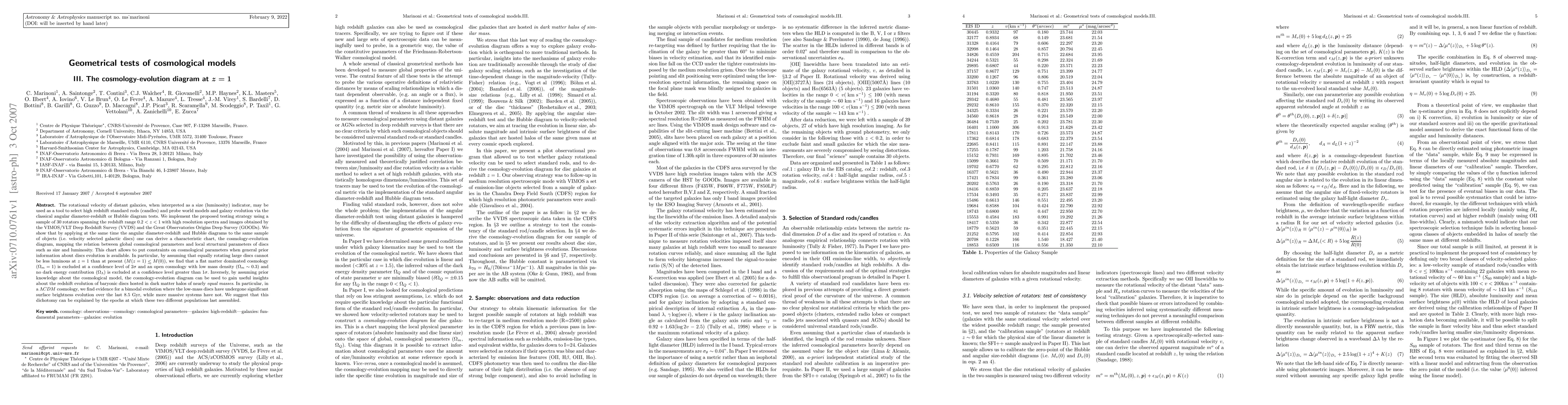 This paper explores the use of galaxy rotational velocities as indicators of size and luminosity to test cosmological models. By analyzing a sample of 30 rotators at redshifts 0.2<z<1, the authors derive a cosmology-evolution diagram that links global cosmological parameters with local structural parameters of galactic discs, finding that a flat matter-dominated cosmology is excluded at 2σ confidence.
