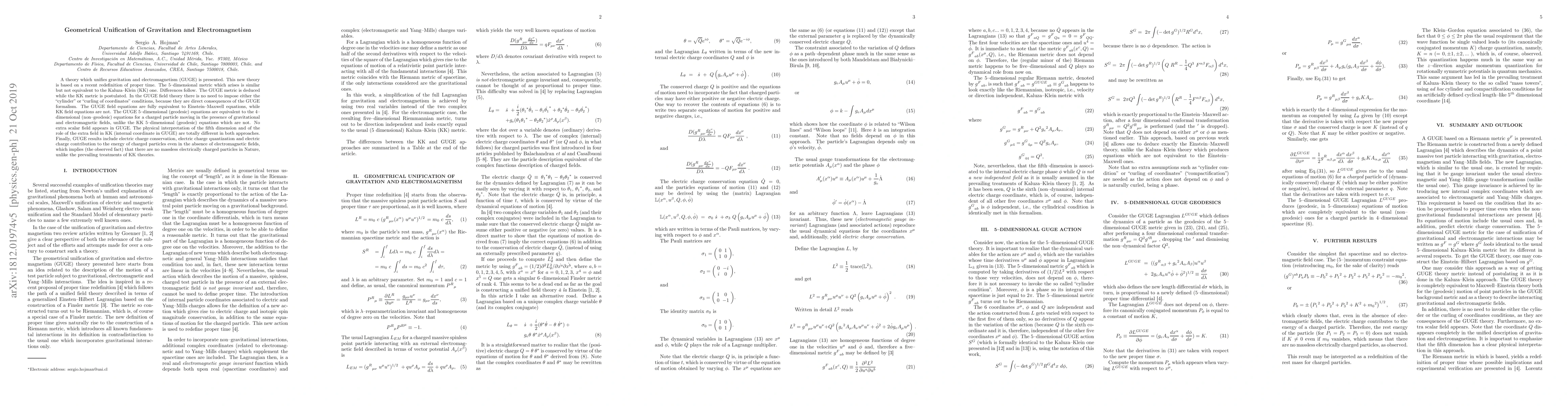 A theory which achieves a complete geometrical unification of gravitation and electromagnetism (GUGE) is presented. This new theory is based on a recent proposal of proper time redefinition that leads to the construction of a Riemann metric, which naturally unifies gravity and electromagnetism. The 5--dimensional Riemann metric which arises looks exactly the same as the one postulated in the Kaluza-Klein (KK) 5-dimensional theory. Nevertheless, there are deep differences between GUGE and KK. The GUGE metric is deduced while the KK metric is postulated. In the GUGE field theory there is no need to impose either of the so called "cylinder" or "curling of coordinates" conditions, because they emerge as direct consequences of the construction of the GUGE metric. The GUGE field equations are fully equivalent to Einstein--Maxwell equations, while KK field equations are not. The GUGE 5--dimensional (geodesic) equations are equivalent to the 4--dimensional (non--geodesic) equations for a charged particle moving in the presence of gravitational and electromagnetic fields, unlike the KK 5--dimensional (geodesic) equations which are not and, in addition, yield non--gauge covariant geodesic equations. No extra scalar field appears in GUGE. The physical interpretation of the fifth dimension and of the role of the extra field in KK (internal coordinate in GUGE) are totally different in both approaches. Finally, GUGE results include electric charge conservation, electric charge quantization and electric charge contribution to the energy of charged particles even in the absence of electromagnetic fields, which implies (the observed fact) that there are no massless electrically charged particles in Nature, unlike the prevailing treatments of KK theories.