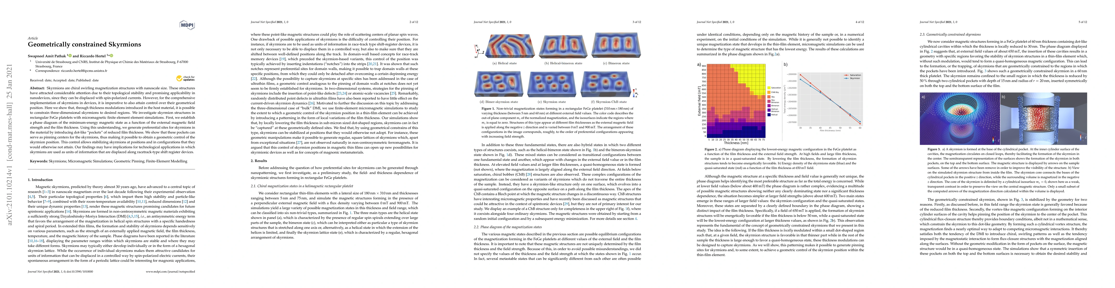 Skyrmions are chiral swirling magnetization structures with nanoscale size. These structures have attracted considerable attention due to their topological stability and promising applicability in nanodevices, since they can be displaced with spin-polarized currents. However, for the comprehensive implementation of skyrmions in devices, it is imperative to also attain control over their geometrical position. Here we show that, through thickness modulations introduced in the host material, it is possible to constrain three-dimensional skyrmions to desired regions. We investigate skyrmion structures in rectangular FeGe platelets with micromagnetic finite element element simulations. First, we establish a phase diagram of the minimum-energy magnetic state as a function of the external magnetic field strength and the film thickness. Using this understanding, we generate preferential sites for skyrmions in the material by introducing dot-like "pockets" of reduced film thickness. We show that these pockets can serve as pinning centers for the skyrmions, thus making it possible to obtain a geometric control of the skyrmion position. This control allows stabilizing skyrmions at positions and in configurations that they would otherwise not attain. Our findings may have implications for technological applications in which skyrmions are used as units of information that are displaced along racetrack-type shift register devices.