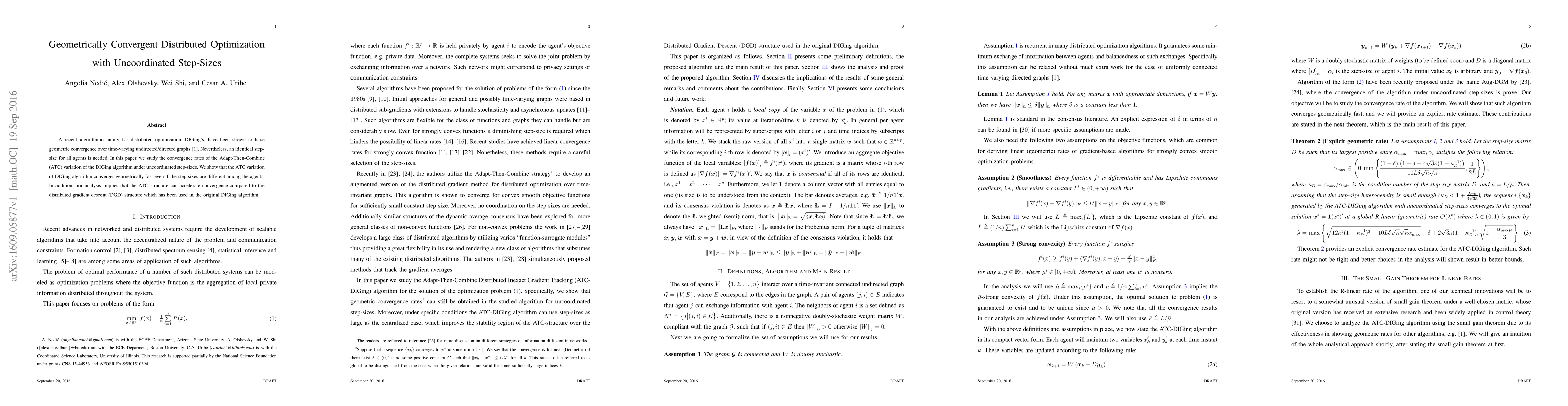 This paper investigates the Adapt-Then-Combine (ATC) variation of the DIGing algorithm for distributed optimization, demonstrating geometric convergence even with uncoordinated step-sizes among agents. The analysis shows that the ATC structure can achieve faster convergence compared to the original distributed gradient descent (DGD) structure.