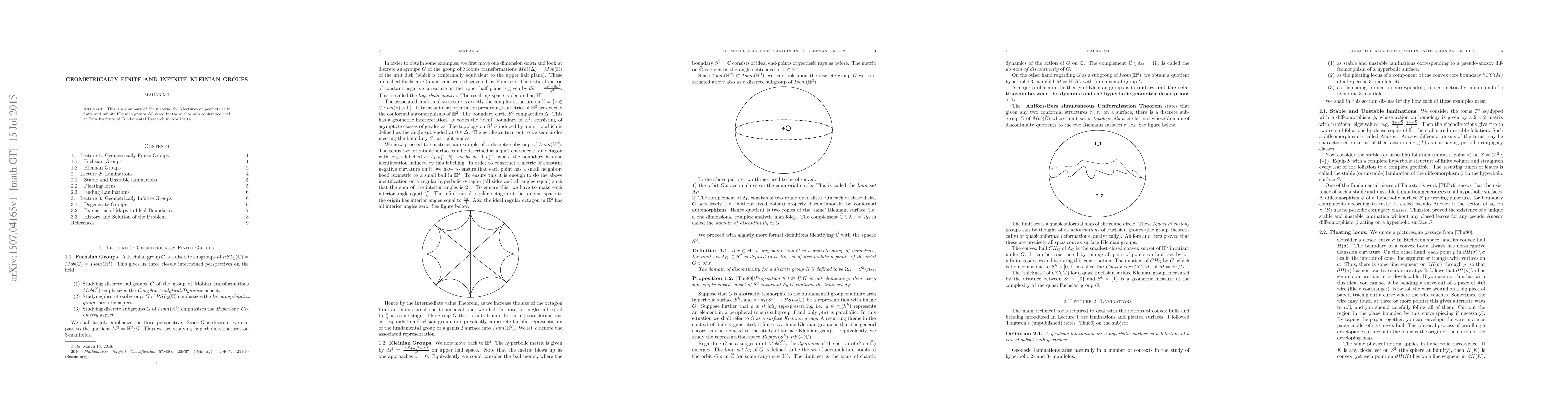 The paper summarizes lectures on geometrically finite and infinite Kleinian groups, discussing their properties, classifications, and implications in hyperbolic geometry and complex analysis, emphasizing the distinction between finite and infinite group behaviors.