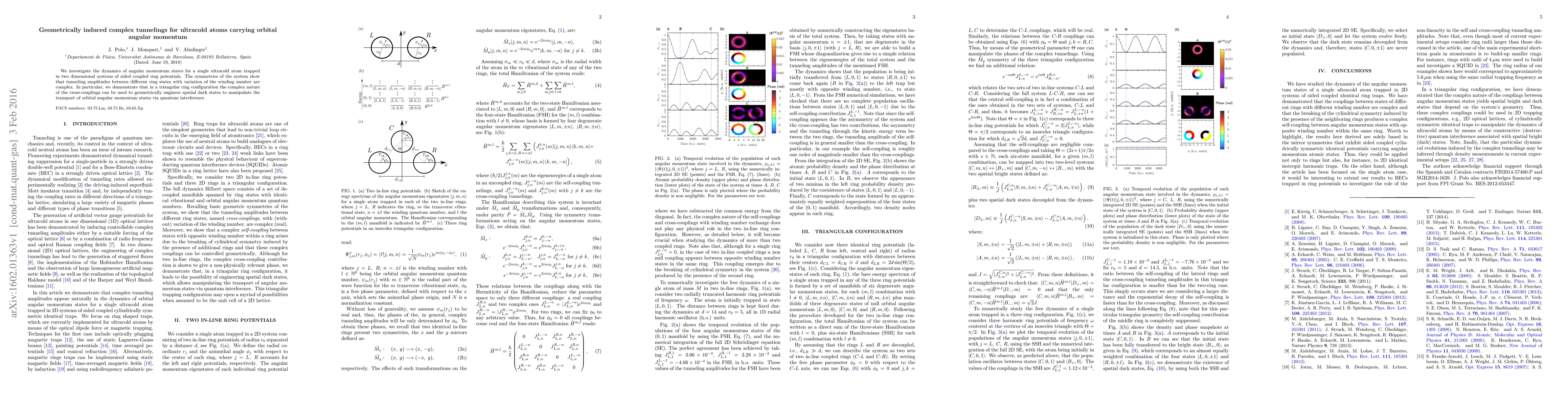 We investigate the dynamics of angular momentum states for a single ultracold atom trapped in two dimensional systems of sided coupled ring potentials. The symmetries of the system show that tunneling amplitudes between different ring states with variation of the winding number are complex. In particular, we demonstrate that in a triangular ring configuration the complex nature of the cross-couplings can be used to geometrically engineer spatial dark states to manipulate the transport of orbital angular momentum states via quantum interference.