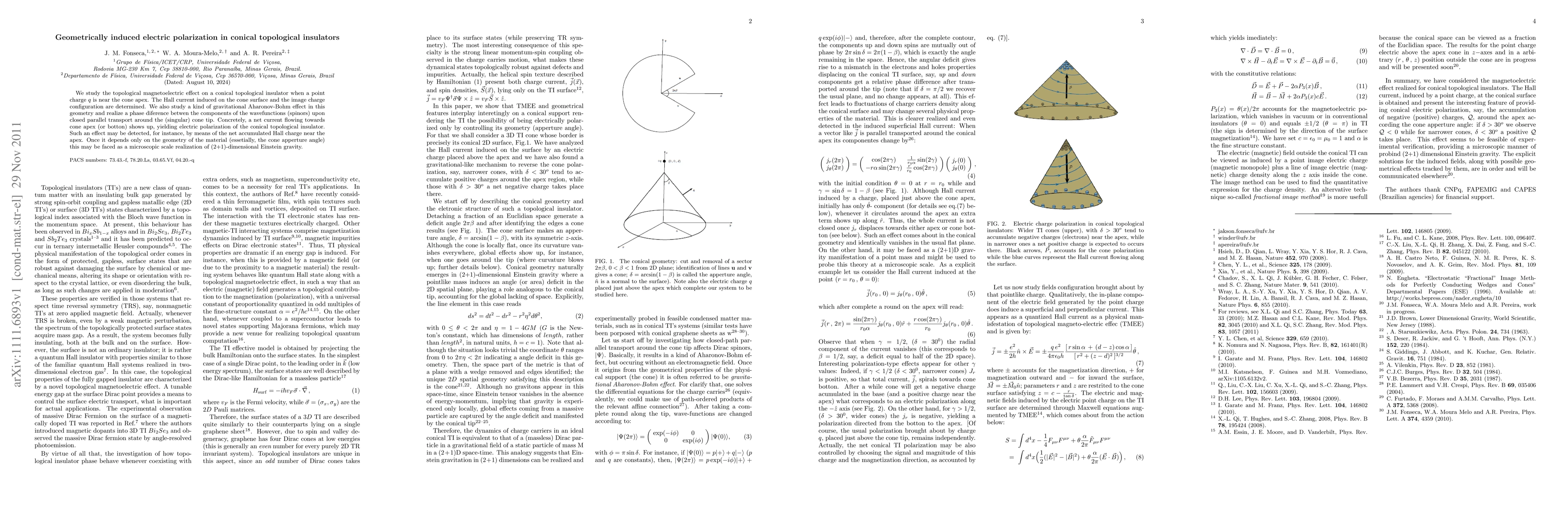 We study the topological magnetoelectric effect on a conical topological insulator when a point charge $q$ is near the cone apex. The Hall current induced on the cone surface and the image charge configuration are determined. We also study a kind of gravitational Aharonov-Bohm effect in this geometry and realize a phase diference betwen the components of the wavefunctions (spinors) upon closed parallel transport around the (singular) cone tip. Concretely, a net current flowing towards cone apex (or botton) shows up, yielding electric polarization of the conical topological insulator. Such an effect may be detected, for instance, by means of the net accumulated Hall charge near the apex. Once it depends only on the geometry of the material (essetially, the cone apperture angle) this may be faced as a microscopic scale realization of (2+1)-dimensional Einstein gravity.