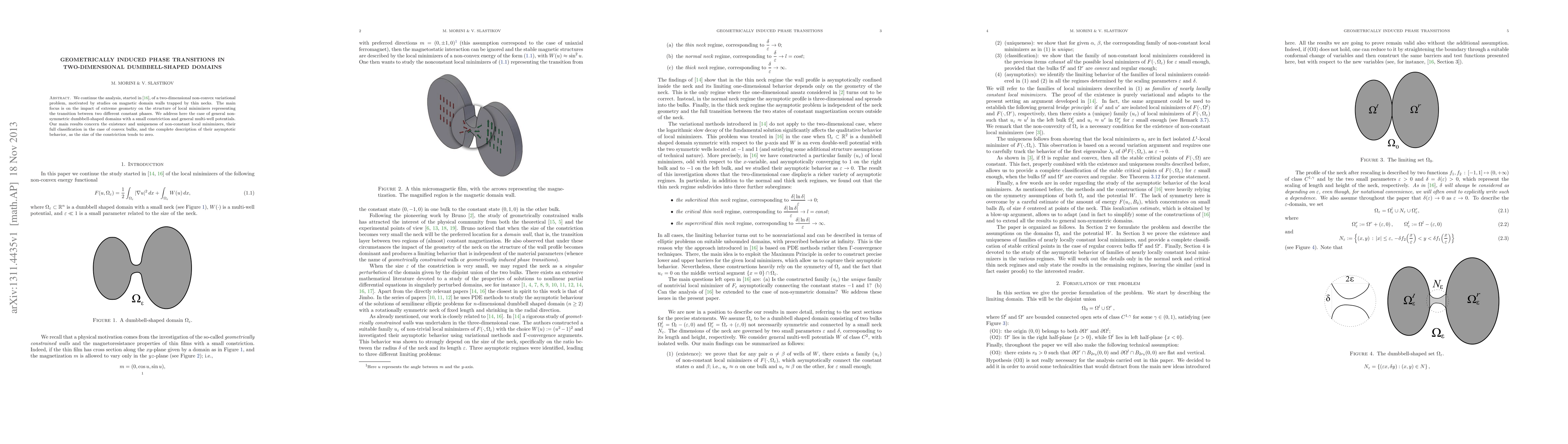 Research investigates phase transitions in 2D dumbbell-shaped domains with small constrictions, focusing on local minimizers representing constant phases and their asymptotic behavior as the constriction size approaches zero.