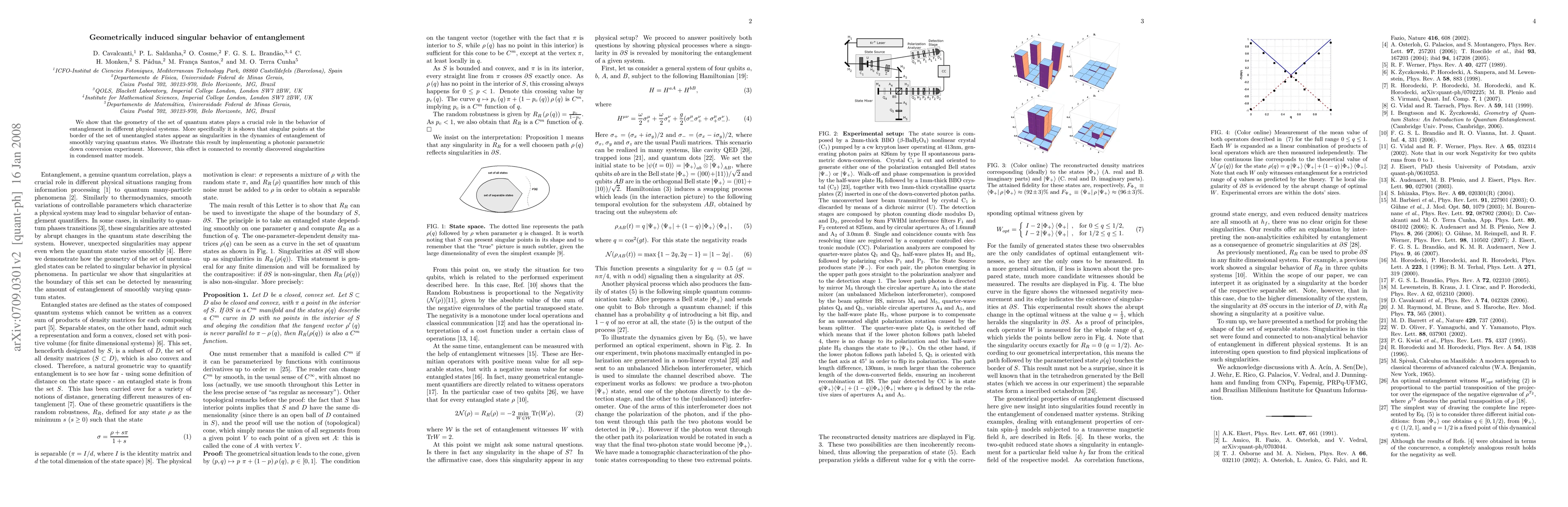 We show that the geometry of the set of quantum states plays a crucial role in the behavior of entanglement in different physical systems. More specifically it is shown that singular points at the border of the set of unentangled states appear as singularities in the dynamics of entanglement of smoothly varying quantum states. We illustrate this result by implementing a photonic parametric down conversion experiment. Moreover, this effect is connected to recently discovered singularities in condensed matter models.
