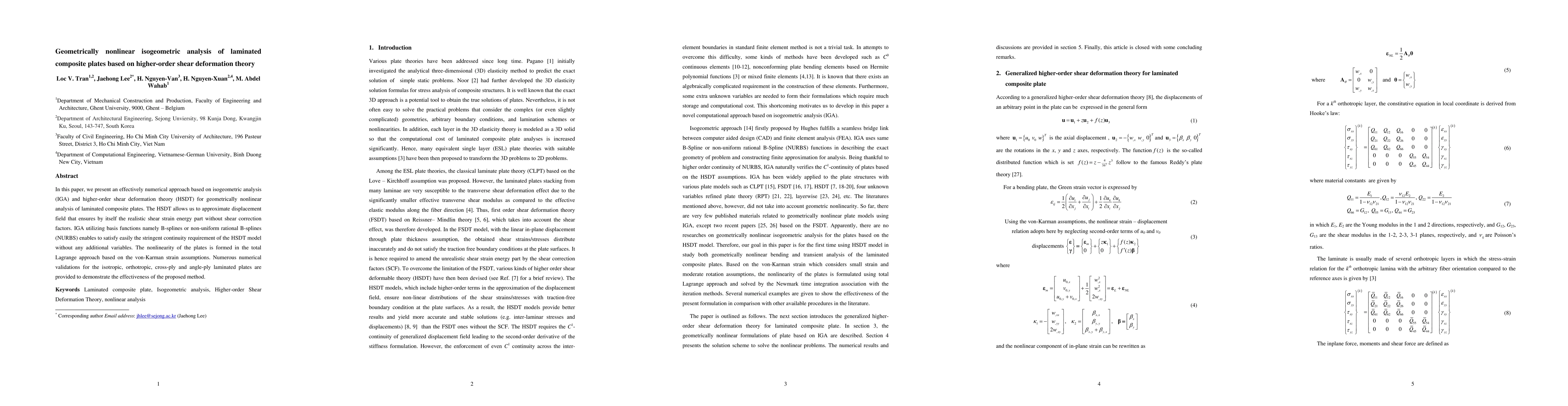 This paper proposes a geometrically nonlinear isogeometric analysis (IGA) approach based on higher-order shear deformation theory (HSDT) for laminated composite plates. The method uses B-splines or NURBS to naturally incorporate shear strain without correction factors, validated through various composite plate configurations.