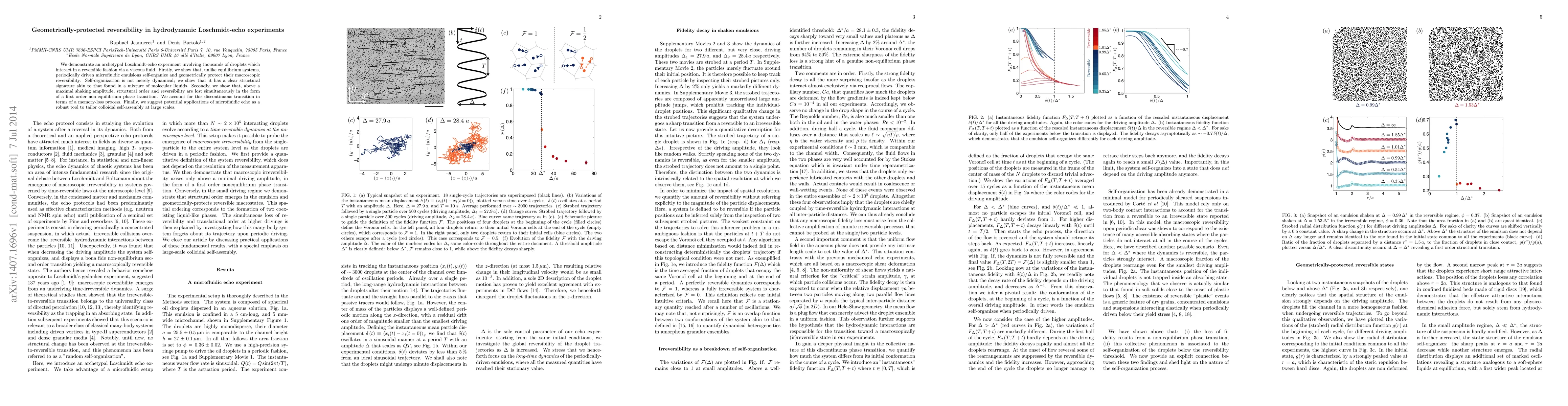 We demonstrate an archetypal Loschmidt-echo experiment involving thousands of droplets which interact in a reversible fashion via a viscous fluid. Firstly, we show that, unlike equilibrium systems, periodically driven microfluidic emulsions self-organize and geometrically protect their macroscopic reversibility. Self-organization is not merely dynamical; we show that it has a clear structural signature akin to that found in a mixture of molecular liquids. Secondly, we show that, above a maximal shaking amplitude, structural order and reversibility are lost simultaneously in the form of a first order non-equilibrium phase transition. We account for this discontinuous transition in terms of a memory-loss process. Finally, we suggest potential applications of microfluidic echo as a robust tool to tailor colloidal self-assembly at large scales.