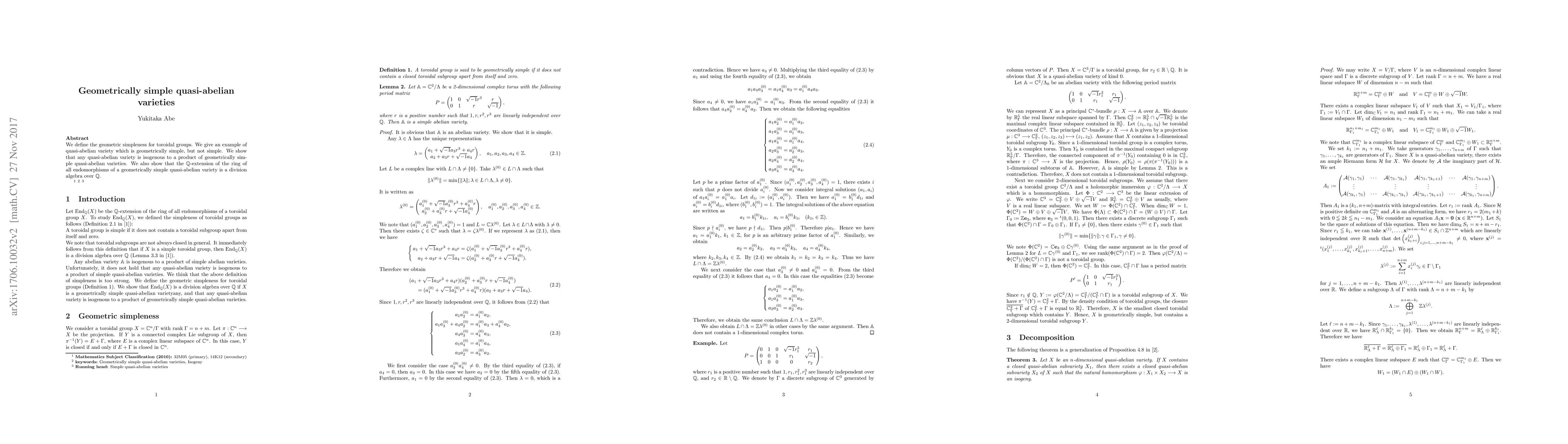 This paper defines geometrically simple toroidal groups and provides an example of a quasi-abelian variety that is geometrically simple but not simple. It demonstrates that any quasi-abelian variety is isogenous to a product of geometrically simple quasi-abelian varieties and shows that the ${\mathbb Q}$-extension of the ring of endomorphisms of a geometrically simple quasi-abelian variety is a division algebra over ${\mathbb Q}$.