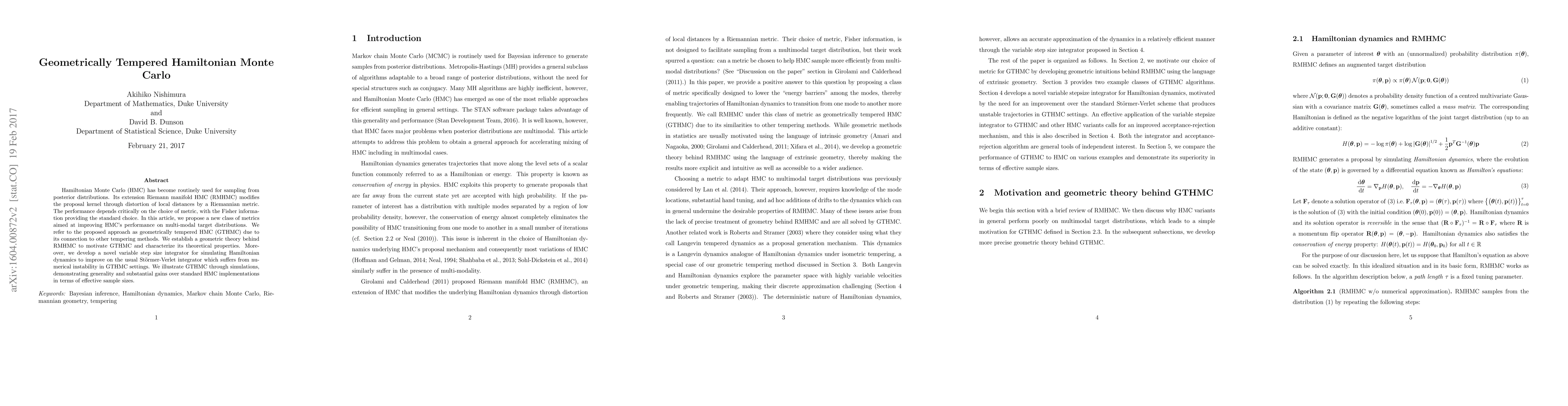This paper introduces geometrically tempered Hamiltonian Monte Carlo (GTHMC), a new approach to improve HMC performance on multi-modal distributions by proposing a novel class of metrics. It also develops a new variable step size integrator to address numerical instability, demonstrating substantial gains over standard HMC in simulations.