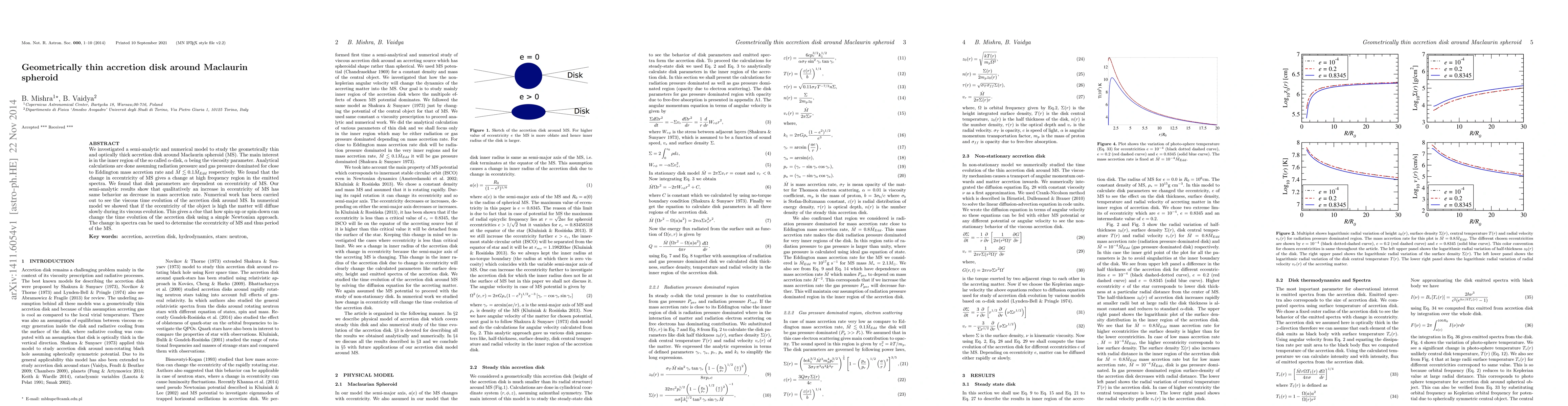 We investigated a semi-analytic and numerical model to study the geometrically thin and optically thick accretion disk around Maclaurin spheroid (MS). The main interest is in the inner region of the so called {\alpha}-disk, {\alpha} being the viscosity parameter. Analytical calculations are done assuming radiation pressure and gas pressure dominated for close to Eddington mass accretion rate and $\dot{M}\lesssim 0.1\dot{M_{Edd}}$ respectively. We found that the change in eccentricity of MS gives a change at high frequency region in the emitted spectra. We found that disk parameters are dependent on eccentricity of MS. Our semi-analytic results show that qualitatively an increase in eccentricity of MS has same behavior as decrease in mass accretion rate. Numerical work has been carried out to see the viscous time evolution of the accretion disk around MS. In numerical model we showed that if the eccentricity of the object is high the matter will diffuse slowly during its viscous evolution. This gives a clue that how spin-up or spin-down can change the time evolution of the accretion disk using a simple Newtonian approach. The change in spectra can be used to determine the eccentricity of MS and thus period of the MS.