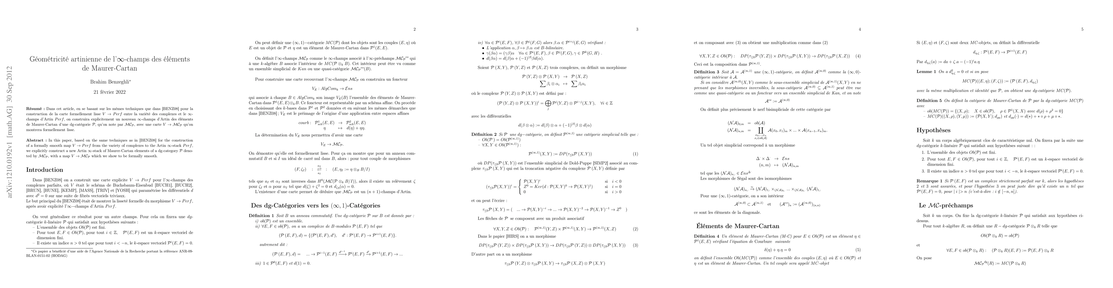In this paper, based on the same techniques as in \cite{BENZ08} for the construction of a formally smooth map $V \to Perf$ from the variety of complexes to the Artin $\infty$-stack $Perf$, we explicitly construct a new Artin $ \infty $-stack of Maurer-Cartan elements of a dg-category $ \mathcal {P} $ denoted by $\mathcal{MC_P} $, with a map $ V \to \mathcal{MC_P} $ which we show to be formally smooth.