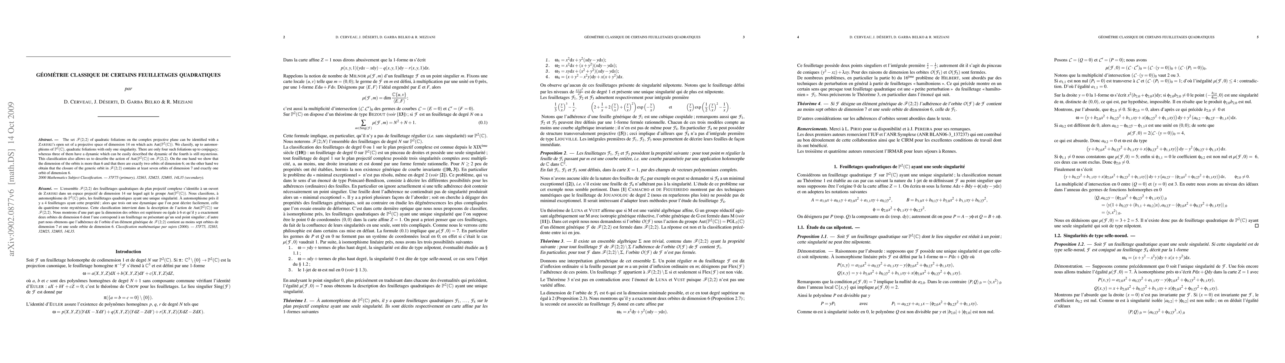 The set $\mathscr{F}(2;2)$ of quadratic foliations on the complex projective plane can be identified with a \textsc{Zariski}'s open set of a projective space of dimension 14 on which acts $\mathrm{Aut}(\mathbb{P}^2(\mathbb{C})).$ We classify, up to automorphisms of $\mathbb{P}^2(\mathbb{C}),$ quadratic foliations with only one singularity. There are only four such foliations up to conjugacy; whereas three of them have a dynamic which can be easily described the dynamic of the fourth is still mysterious. This classification also allows us to describe the action of $\mathrm{Aut}(\mathbb{P}^2(\mathbb{C}))$ on $\mathscr{F}(2;2).$ On the one hand we show that the dimension of the orbits is more than 6 and that there are exactly two orbits of dimension $6;$ on the other hand we obtain that the closure of the generic orbit in $\mathscr{F} (2;2)$ contains at least seven orbits of dimension~7 and exactly one orbit of dimension $6.$