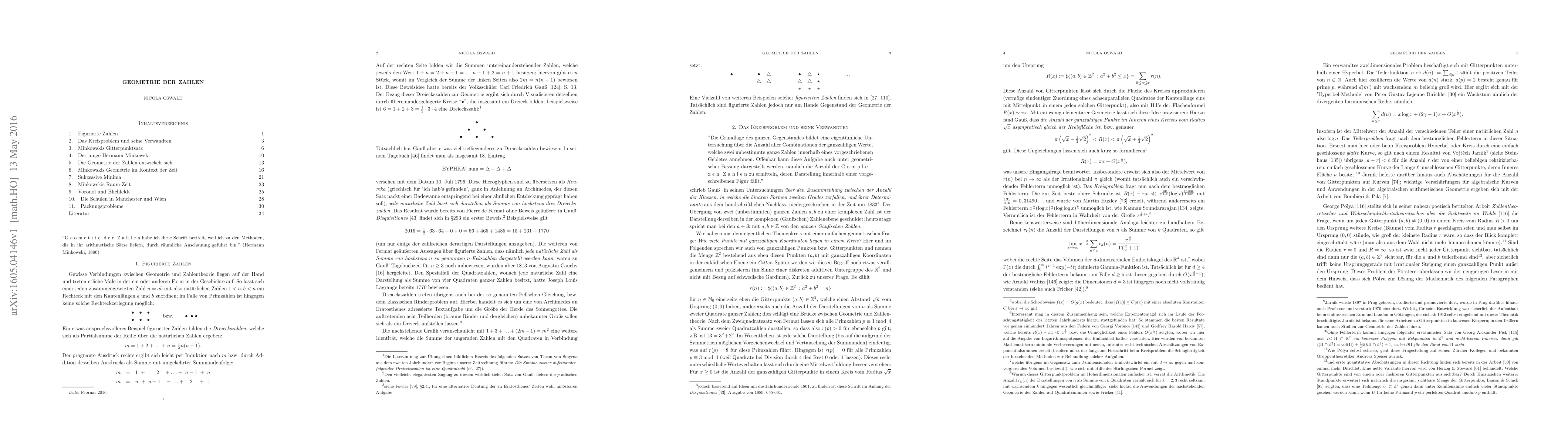 This article provides a historical overview of Geometry of Numbers. 1. Figures, 2. The circuit problem and its relatives, 3. Minkowski lattice point set, 4. The young Hermann Minkowski, 5. The geometry of numbers develops, 6. Minkowski geometry in the context of time, 7. Successive minima, 8. Minkowski space-time, 9. Voronoi and Blichfeldt, 10. The schools in Manchester and Vienna, 11. packing problems