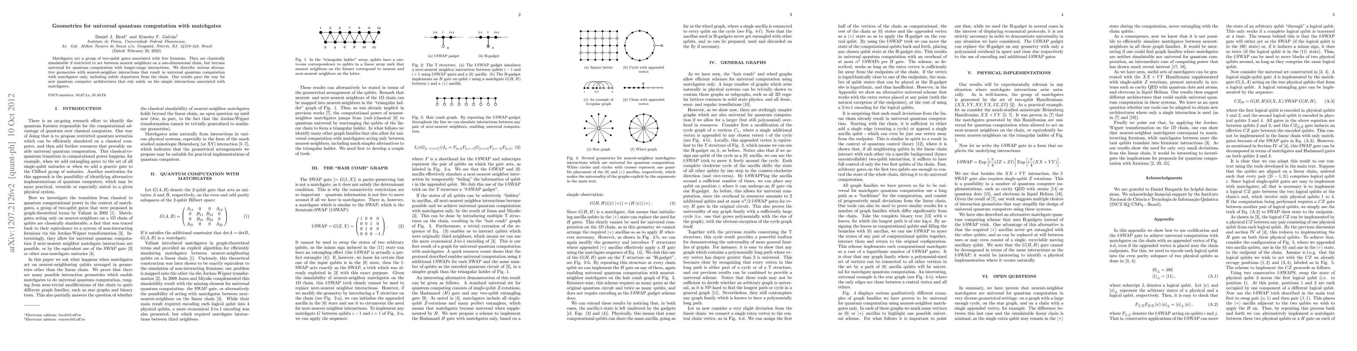Matchgates are a group of two-qubit gates associated with free fermions. They are classically simulatable if restricted to act between nearest neighbors on a one-dimensional chain, but become universal for quantum computation with longer-range interactions. We describe various alternative geometries with nearest-neighbor interactions that result in universal quantum computation with matchgates only, including subtle departures from the chain. Our results pave the way for new quantum computer architectures that rely solely on the simple interactions associated with matchgates.