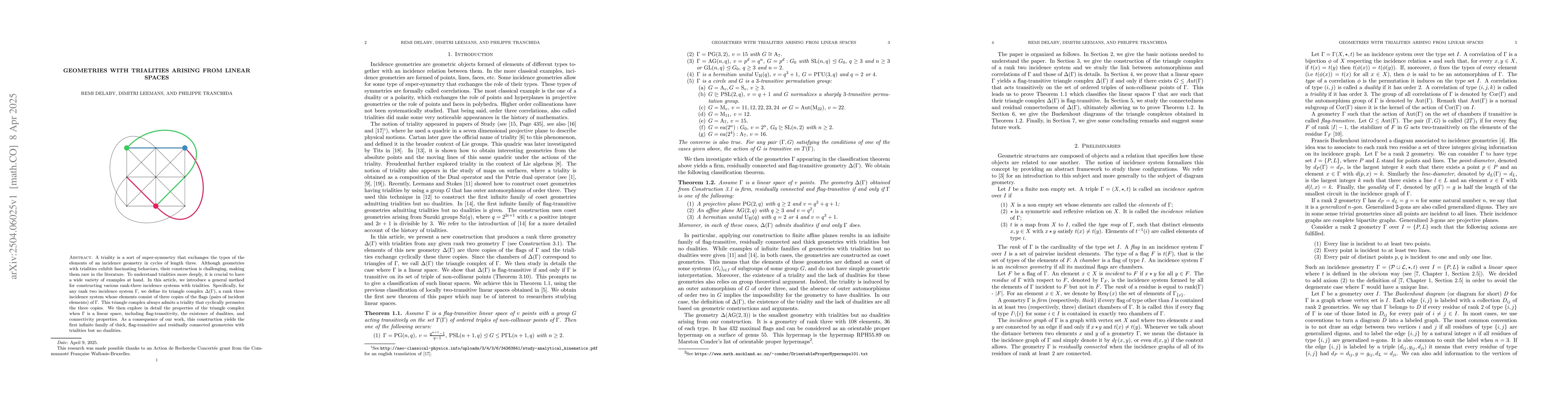 Researchers introduce a method to construct various rank-three incidence systems with trialities, leading to the discovery of infinite families of flag-transitive and residually connected geometries without dualities.