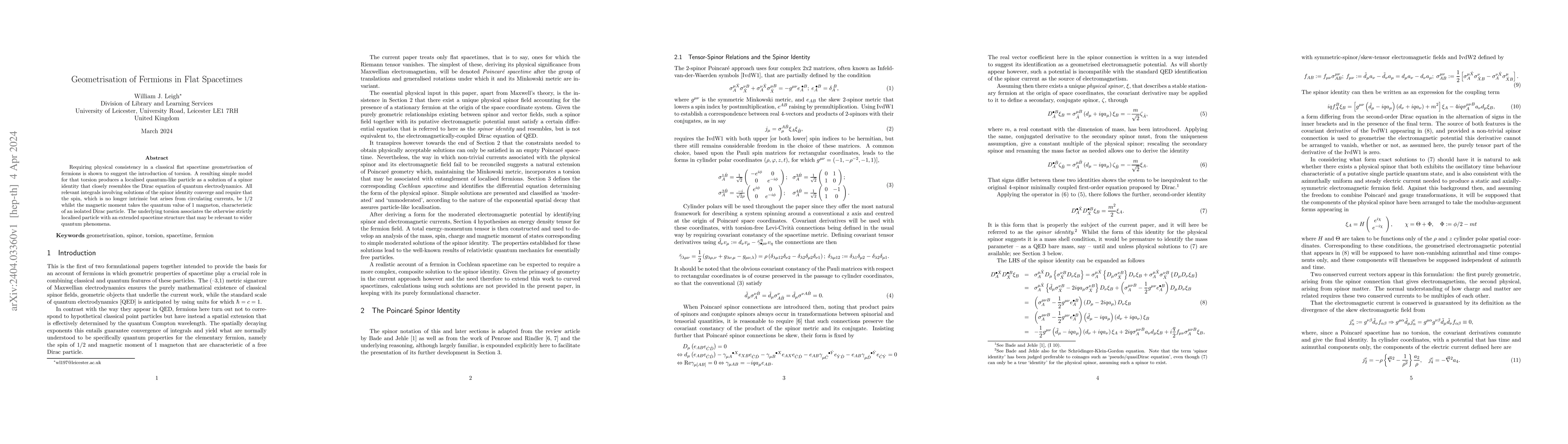 Requiring physical consistency in a classical flat spacetime geometrisation of fermions is shown to suggest the introduction of torsion. A resulting simple model for that torsion produces a localised quantum-like particle as a solution of a spinor identity that closely resembles the Dirac equation of quantum electrodynamics. All relevant integrals involving solutions of the spinor identity converge and require that the spin, which is no longer intrinsic but arises from circulating currents, be 1/2 whilst the magnetic moment takes the quantum value of 1 magneton, characteristic of an isolated Dirac particle. The underlying torsion associates the otherwise strictly localised particle with an extended spacetime structure that may be relevant to wider quantum phenomena.