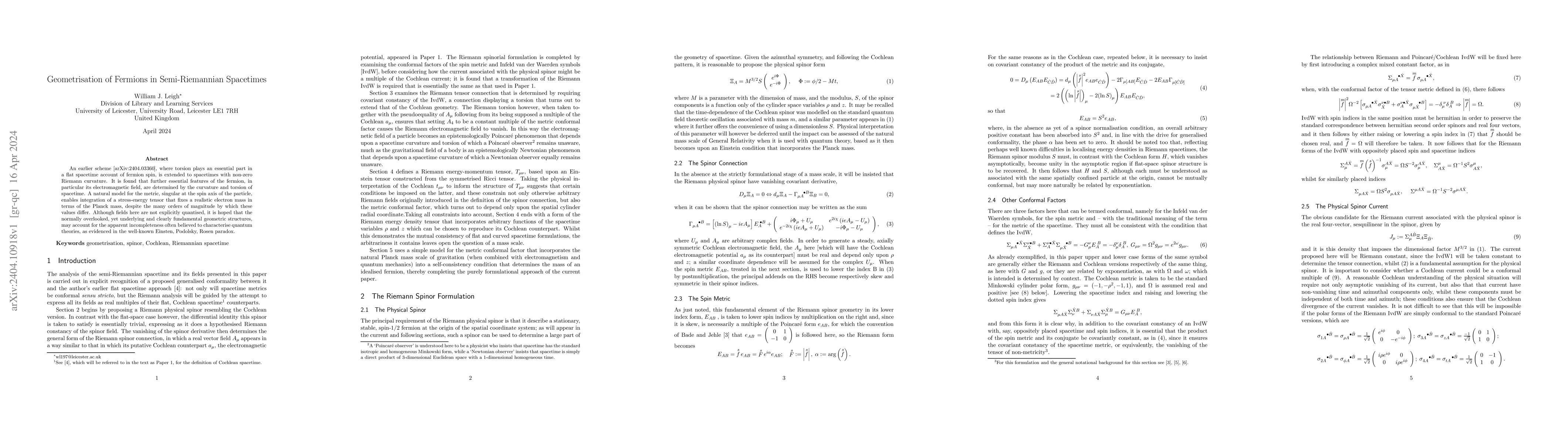 An earlier scheme [arXiv:2404.03360], where torsion plays an essential part in a flat spacetime account of fermion spin, is extended to spacetimes with non-zero Riemann curvature. It is found that further essential features of the fermion, in particular its electromagnetic field, are determined by the curvature and torsion of spacetime. A natural model for the metric, singular along the spin axis of the particle, permits integration of a stress-energy tensor that fixes a realistic electron mass in terms of the Planck mass, despite the many orders of magnitude by which these values differ.