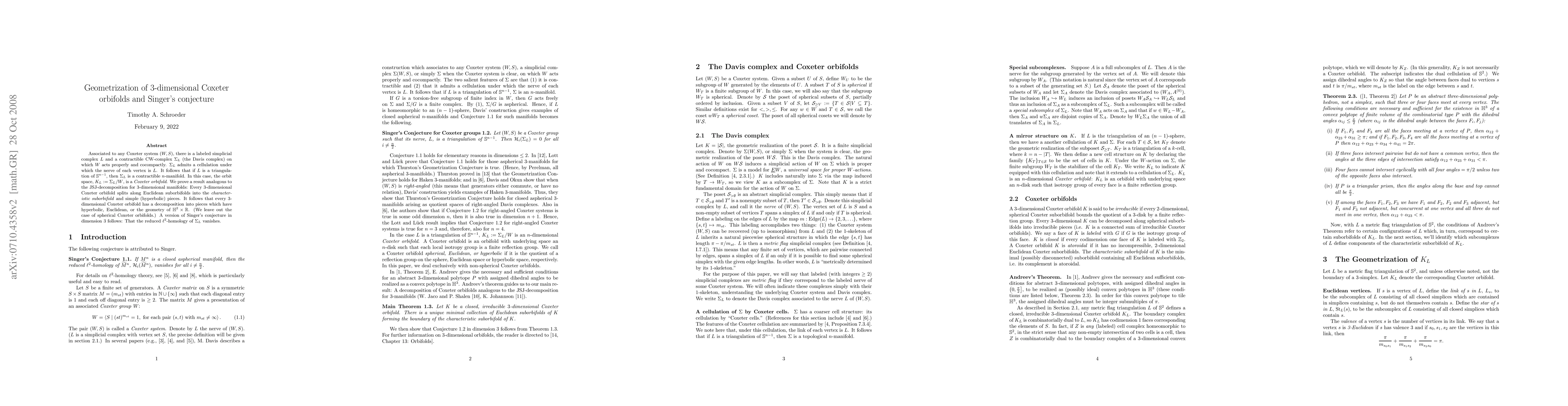 This paper demonstrates the geometrization of 3-dimensional Coxeter orbifolds by establishing a decomposition analogous to the JSJ-decomposition, proving that each such orbifold can be split into hyperbolic, Euclidean, or $\mathbb{H}^2\times\mathbb{R}$ pieces, and supporting a version of Singer's conjecture on the vanishing of the reduced $\ell^2$-homology of the Davis complex.