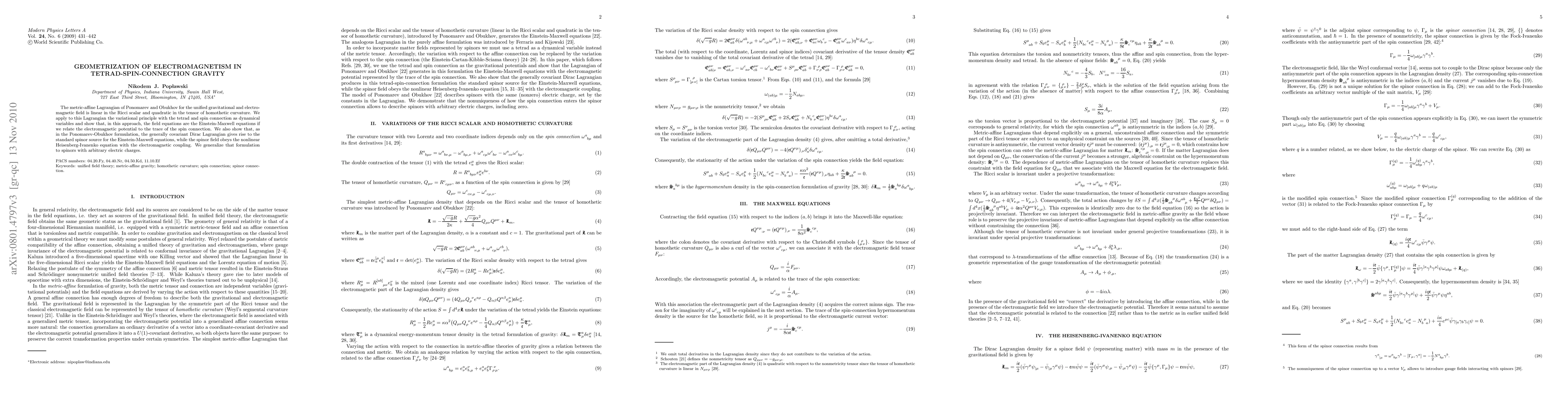The metric-affine Lagrangian of Ponomarev and Obukhov for the unified gravitational and electromagnetic field is linear in the Ricci scalar and quadratic in the tensor of homothetic curvature. We apply to this Lagrangian the variational principle with the tetrad and spin connection as dynamical variables and show that, in this approach, the field equations are the Einstein-Maxwell equations if we relate the electromagnetic potential to the trace of the spin connection. We also show that, as in the Ponomarev-Obukhov formulation, the generally covariant Dirac Lagrangian gives rise to the standard spinor source for the Einstein-Maxwell equations, while the spinor field obeys the nonlinear Heisenberg-Ivanenko equation with the electromagnetic coupling. We generalize that formulation to spinors with arbitrary electric charges.