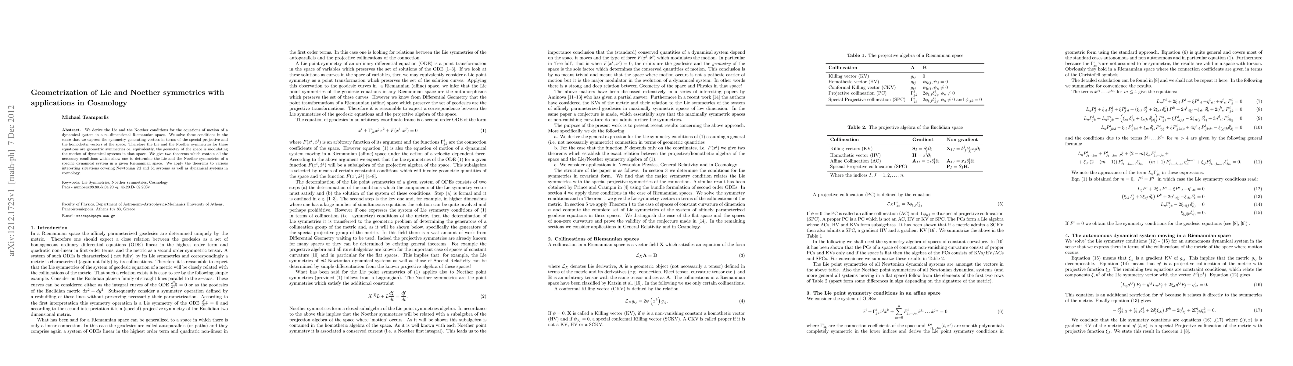 This paper derives Lie and Noether symmetries in the context of dynamical systems within $n$-dimensional Riemannian spaces, expressing these symmetries geometrically in terms of projective and homothetic vectors. It presents theorems to determine these symmetries and applies them to Newtonian systems and cosmological models.