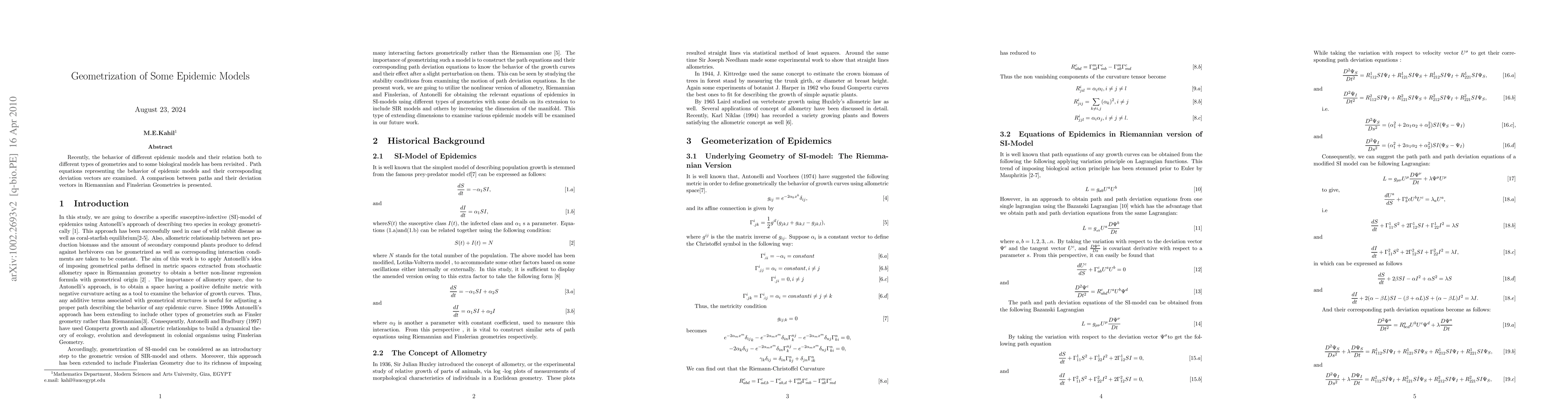 Recently, the behavior of different epidemic models and their relation both to different types of geometries and to some biological models has been revisited . Path equations representing the behavior of epidemic models and their corresponding deviation vectors are examined. A comparison between paths and their deviation vectors in Riemannian and Finslerian Geometries is presented.