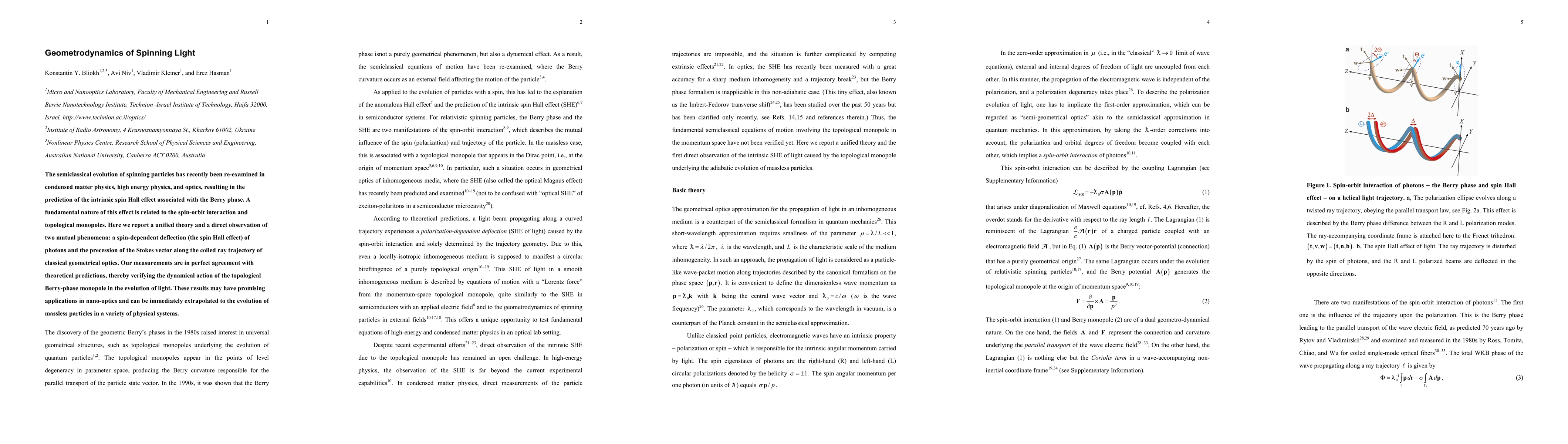 The semiclassical evolution of spinning particles has recently been re-examined in condensed matter physics, high energy physics, and optics, resulting in the prediction of the intrinsic spin Hall effect associated with the Berry phase. A fundamental nature of this effect is related to the spin-orbit interaction and topological monopoles. Here we report a unified theory and a direct observation of two mutual phenomena: a spin-dependent deflection (the spin Hall effect) of photons and the precession of the Stokes vector along the coiled ray trajectory of classical geometrical optics. Our measurements are in perfect agreement with theoretical predictions, thereby verifying the dynamical action of the topological Berry-phase monopole in the evolution of light. These results may have promising applications in nano-optics and can be immediately extrapolated to the evolution of massless particles in a variety of physical systems.